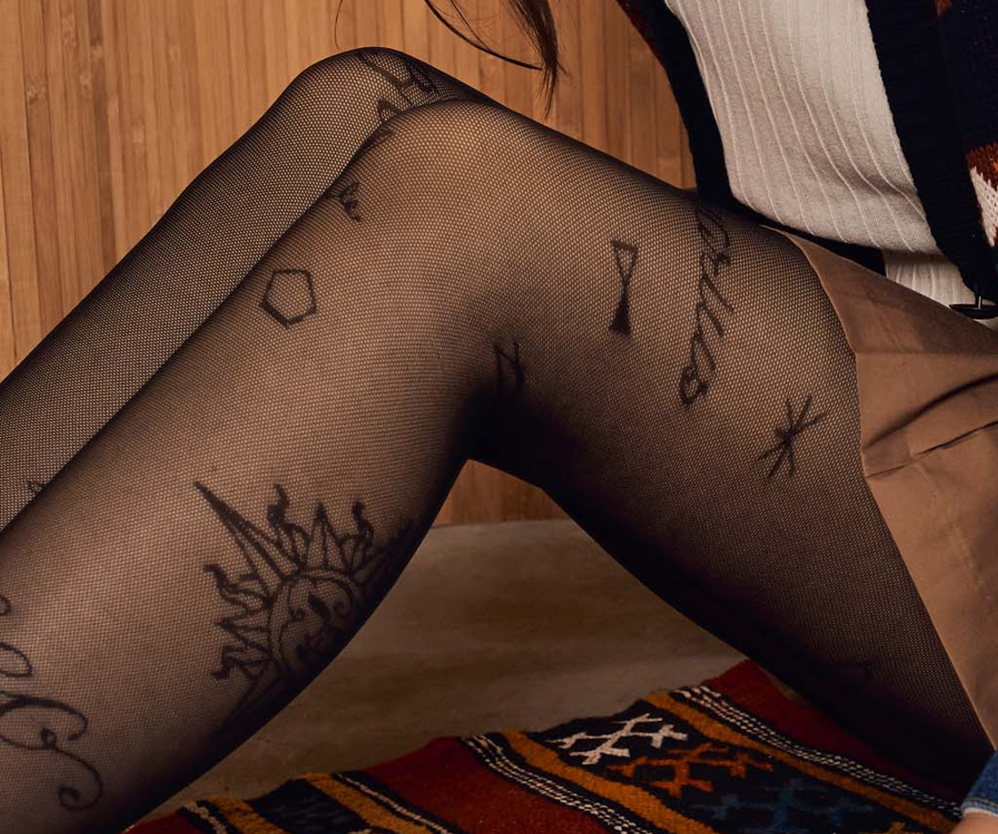 These tights feature a delicate mesh, with an eclectic pattern that corresponds to astrological symbols and covers the whole surface, from the waist to the toes.
