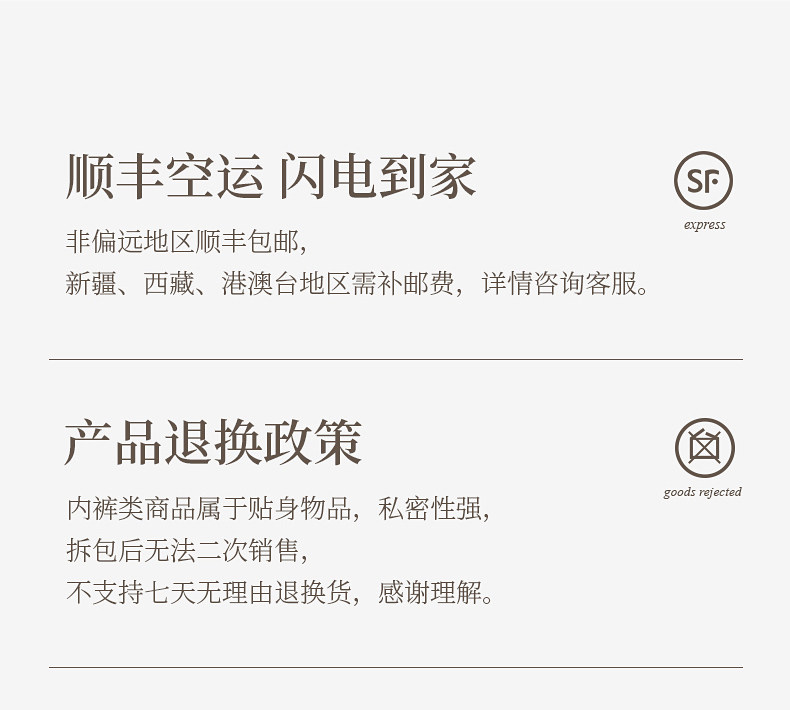 內褲類商品屬于貼身私密物品,拆包后不支持七天無理由退換貨