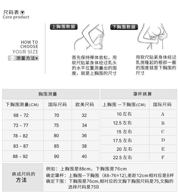 MM們注意啦!首次購買歐美文胸,建議裸量一下自己的上下胸圍來參考購買。避免退換貨。