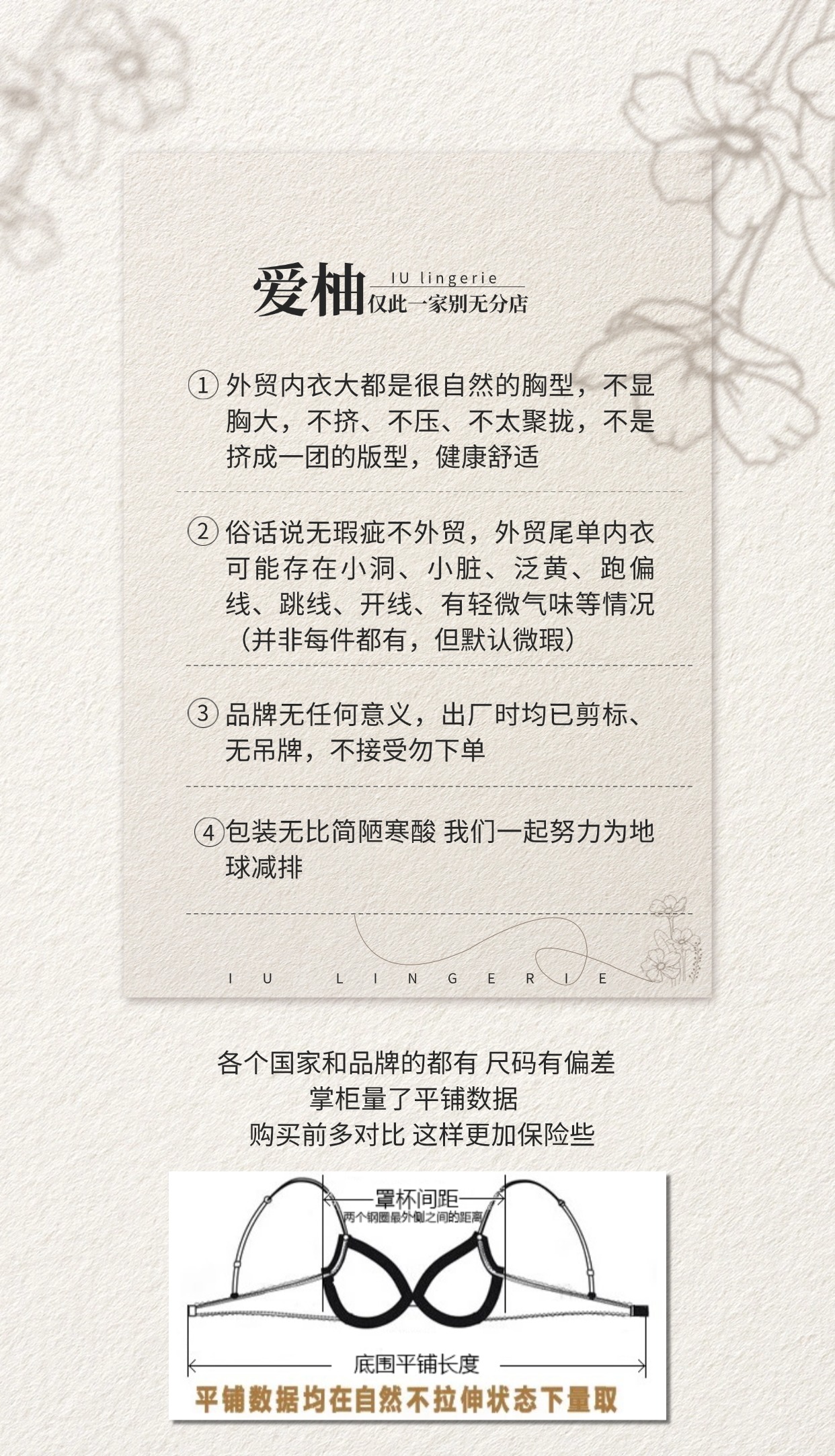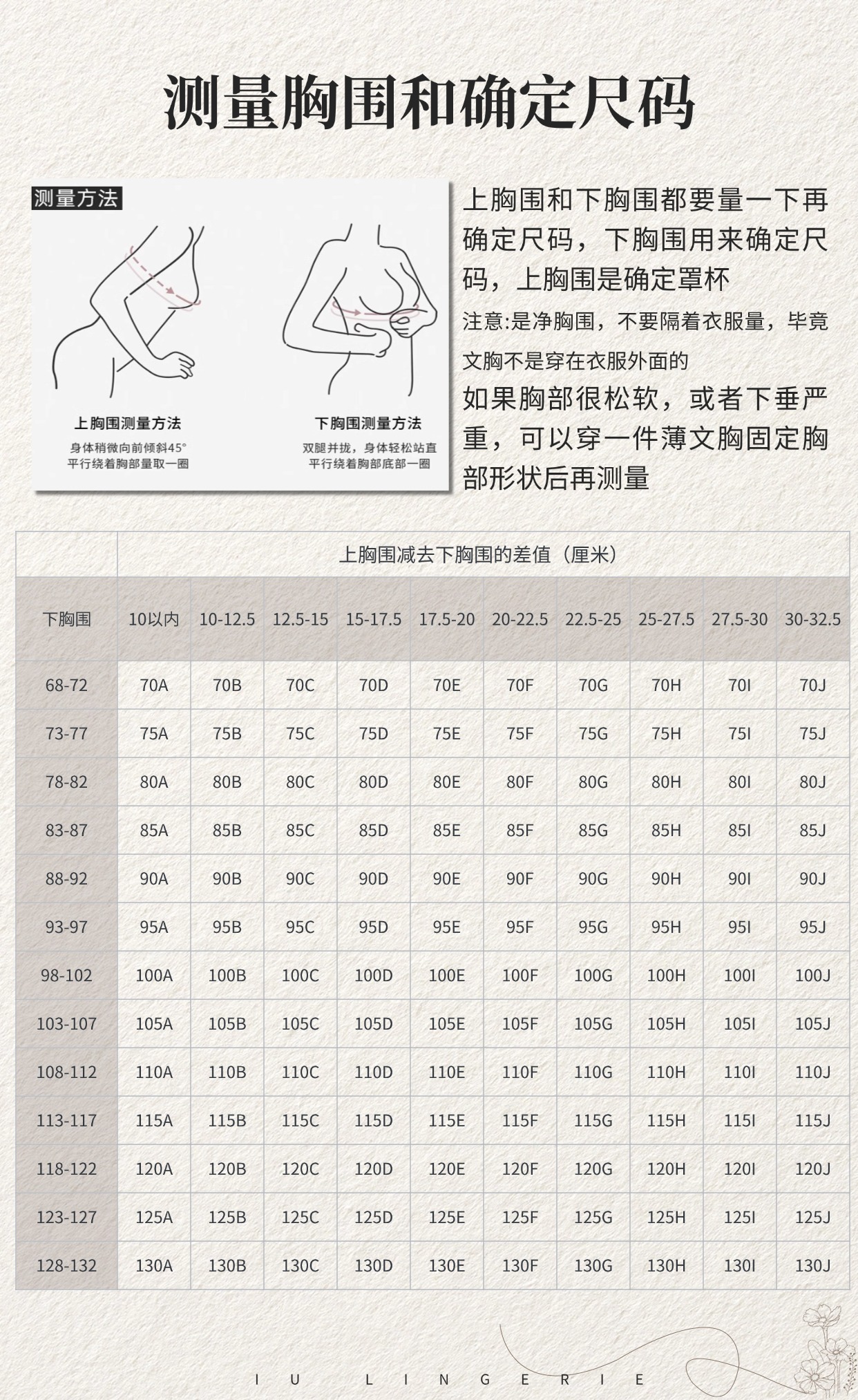尺碼 | 整個底圍 平鋪長度--適度拉伸 | 罩杯鋼圈間距 | 其他 | ||||