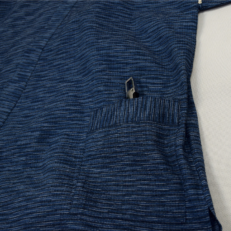 肩線有縷空設計,上衣下擺兩側有開口。褲子有前開口的方便設計,雙側口袋。