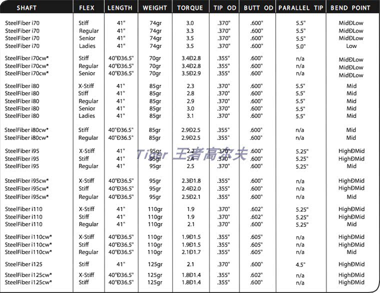 全新型的Aerotech SteelFiber 碳素與鋼結合桿身,在高噸位碳纖外層再包一層鋼纖絲,讓桿身具有碳桿的彈性及擊球距離,也有鋼桿身的手感及穩定。單支長度41英寸,TIP端355和370外徑,通過裁切長度組裝不同號碼。