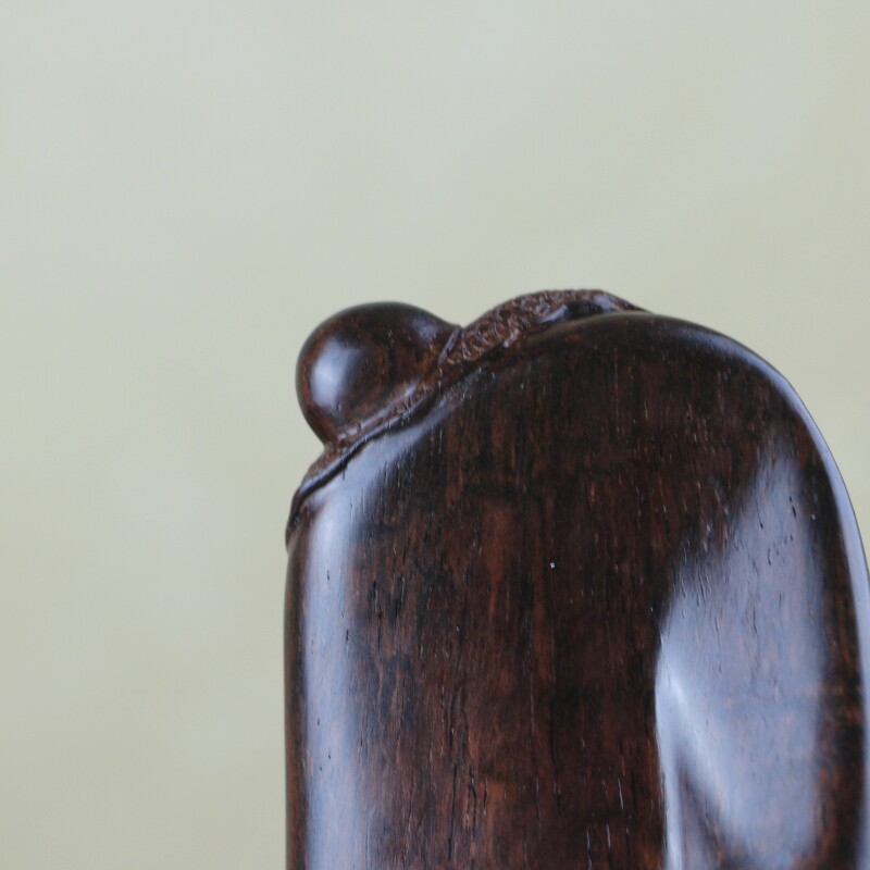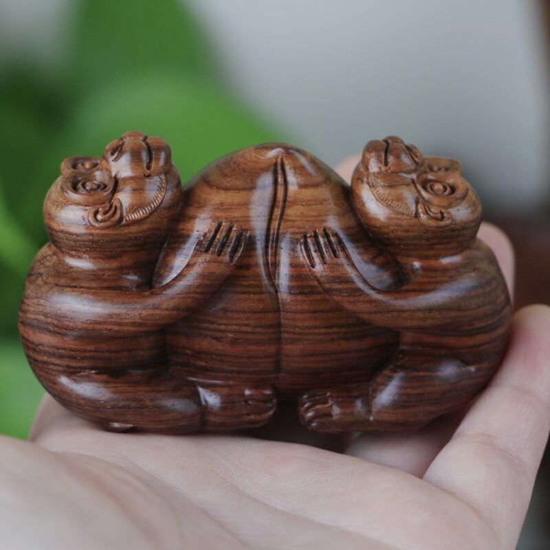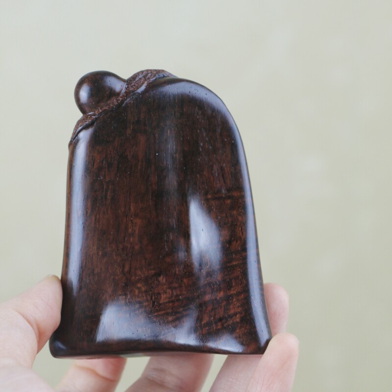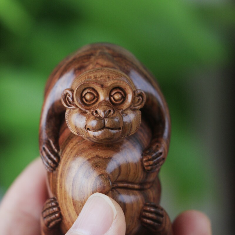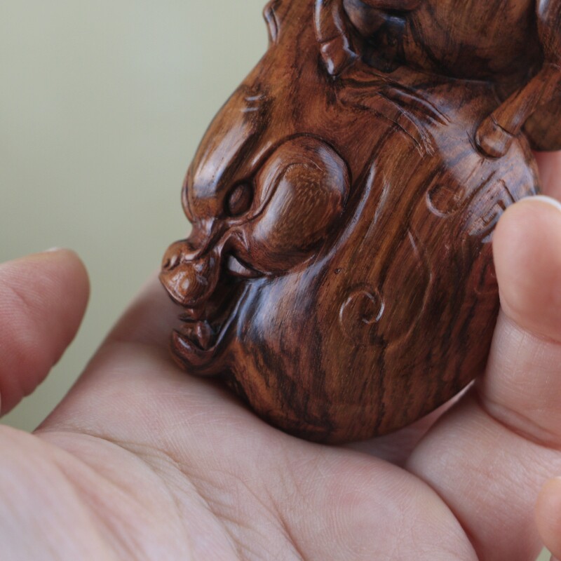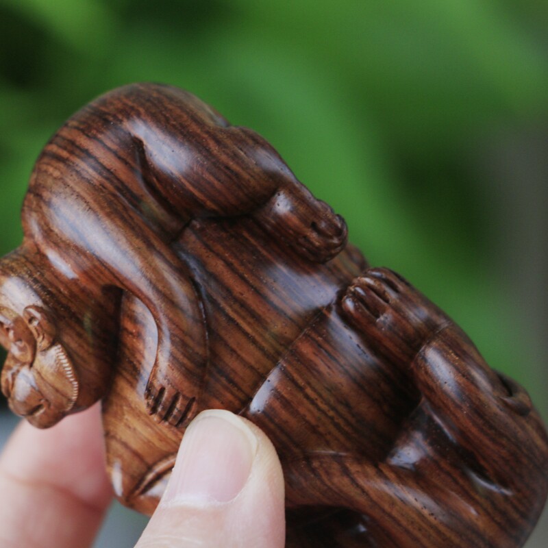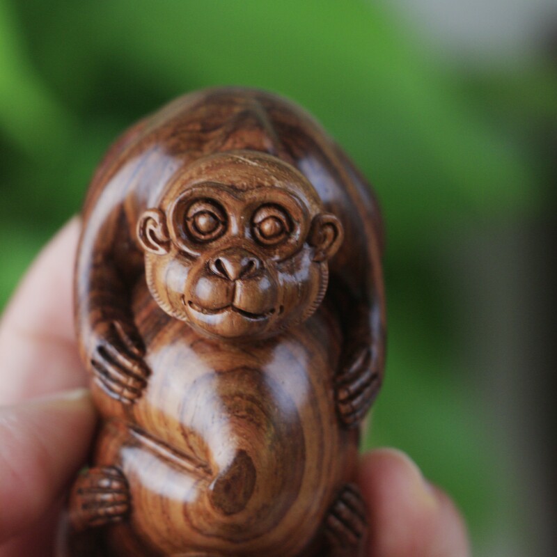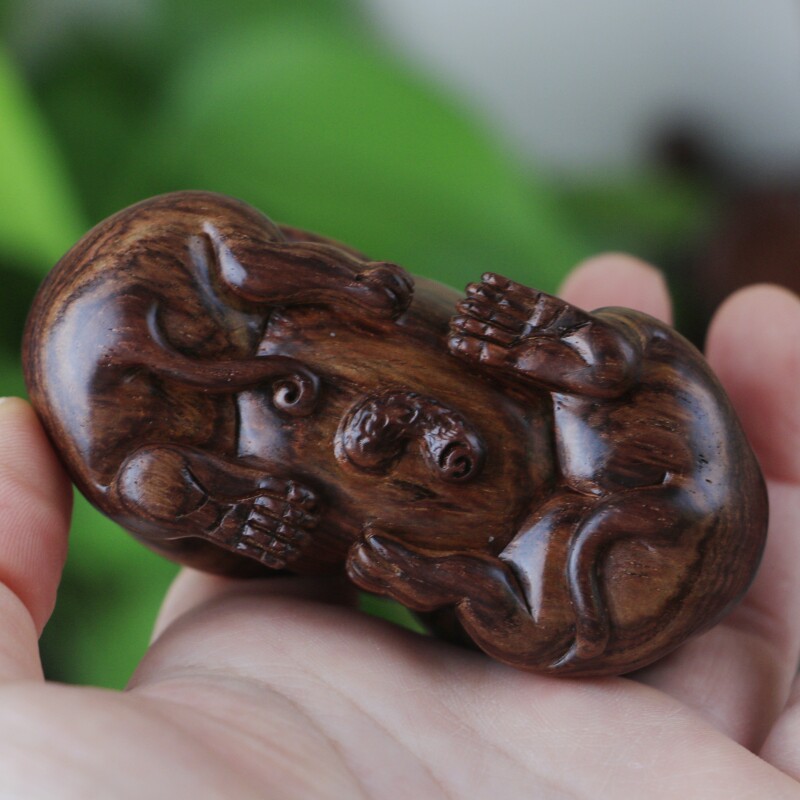 海南黃花梨老料手把件,靈猴獻壽,規整飽滿圓潤,熒光通透,質感細膩,大黑線清晰,規格:78*38*46mm,重量66g