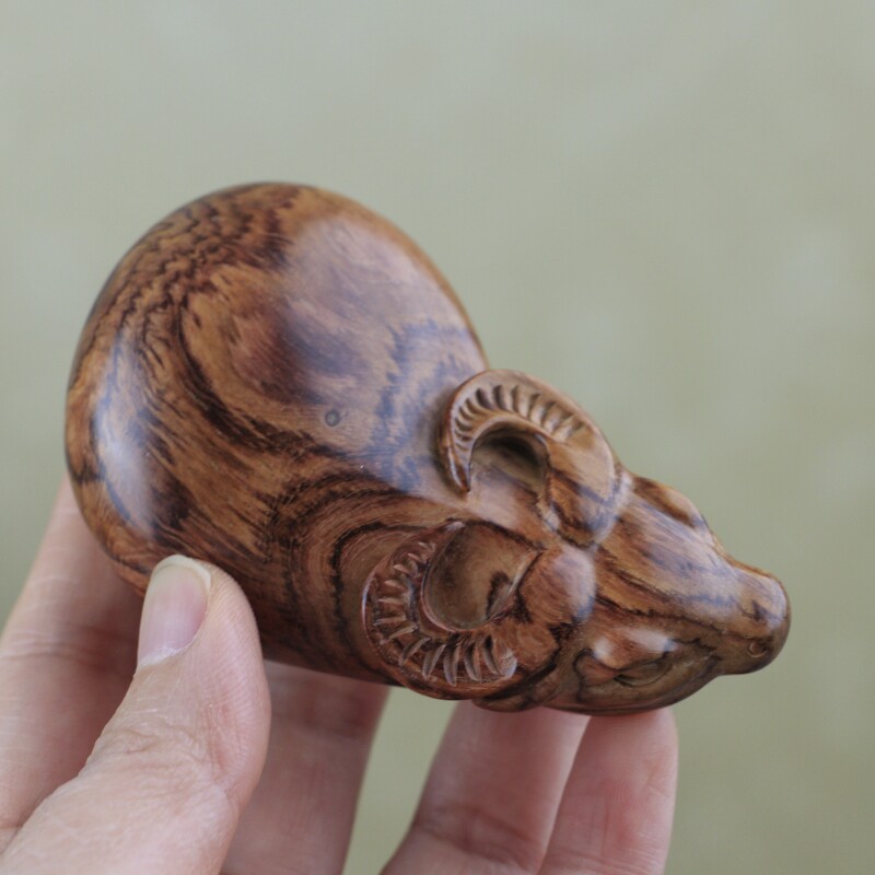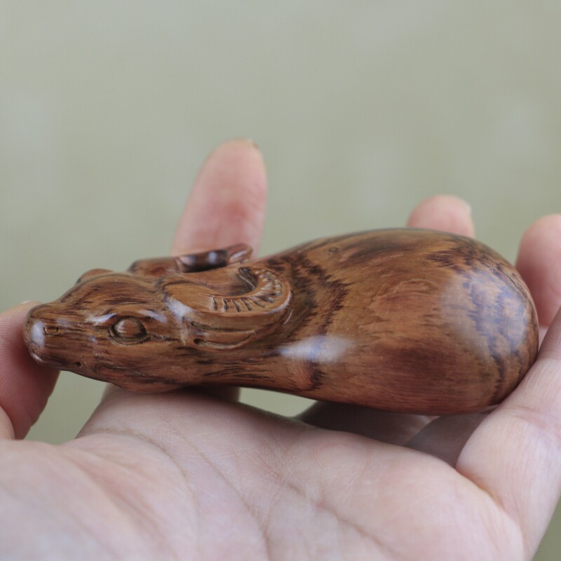 海南黃花梨牛手把件,紋理灑脫絢麗,底子干凈,全手工制作,規格:82*50*28mm,重量44克