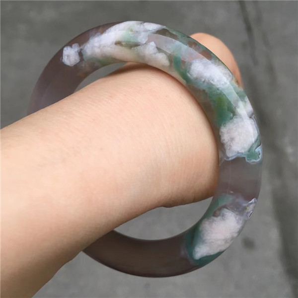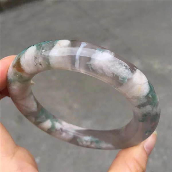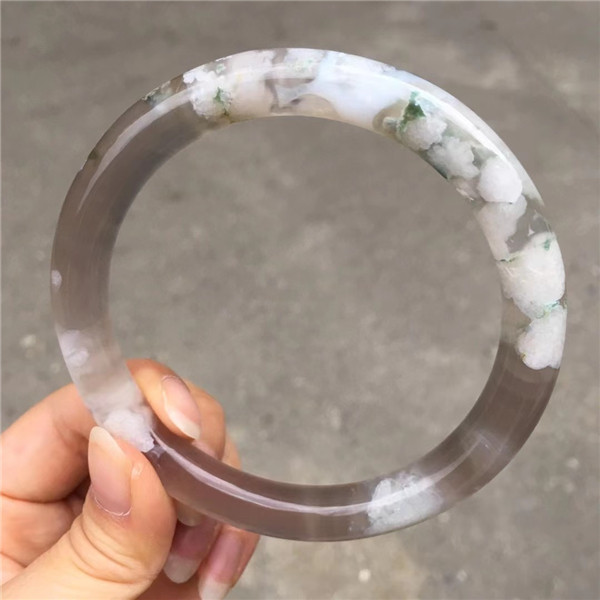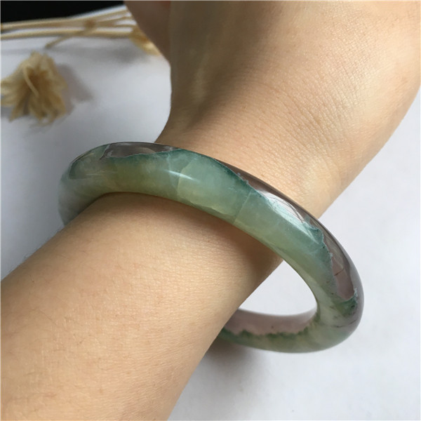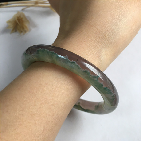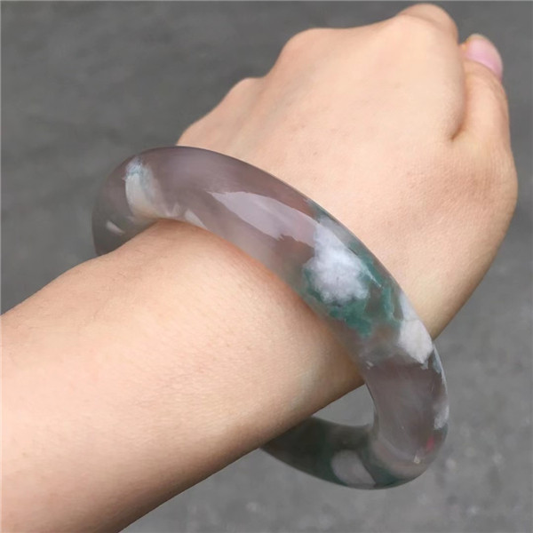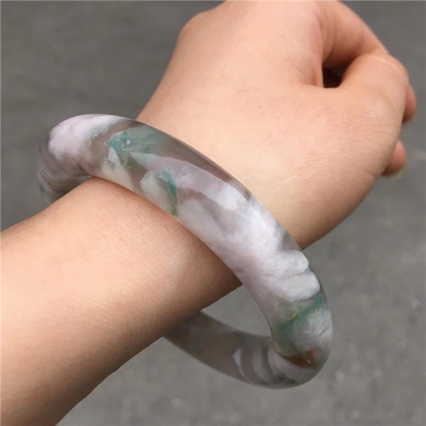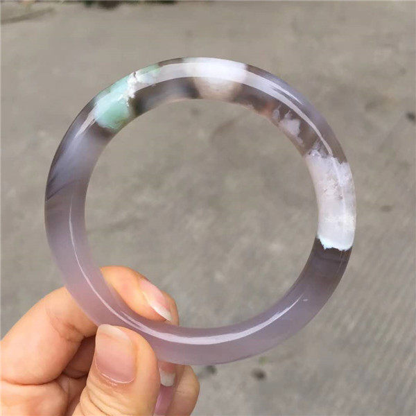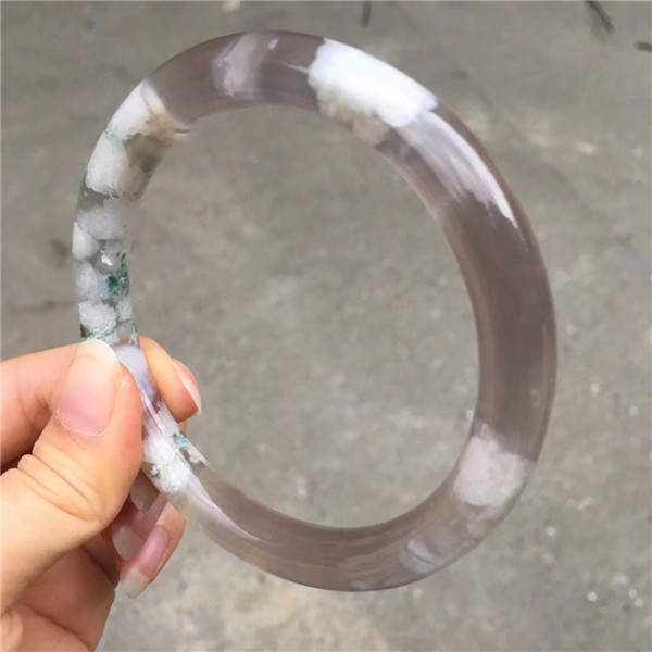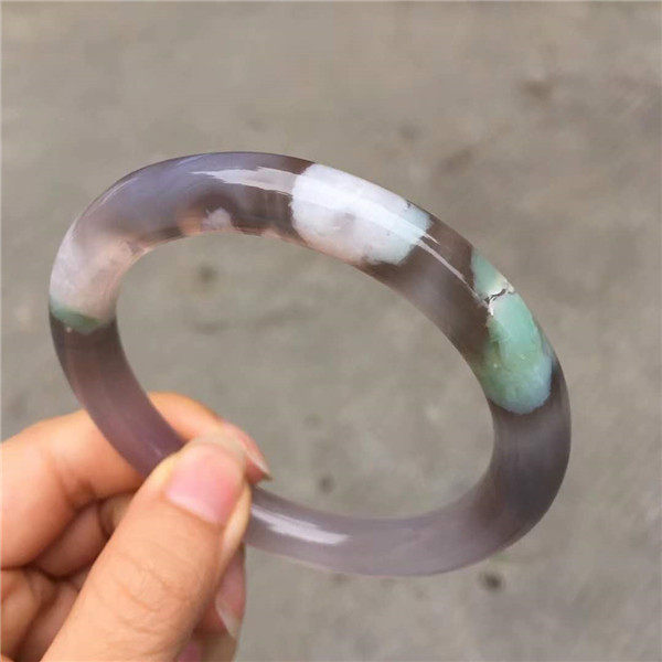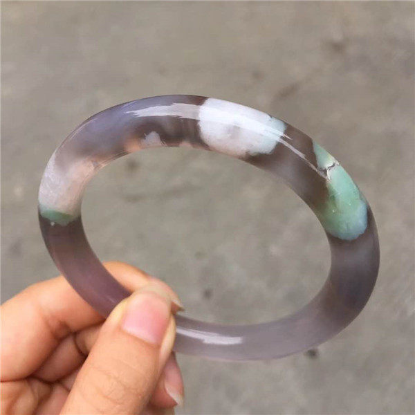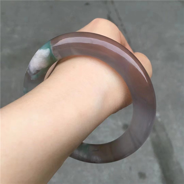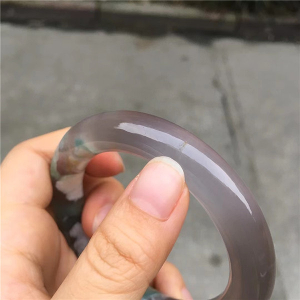 一半是像湖水一樣冰潤的紫灰冰底,一鐲兩風景。綠色部分有亮晶晶的