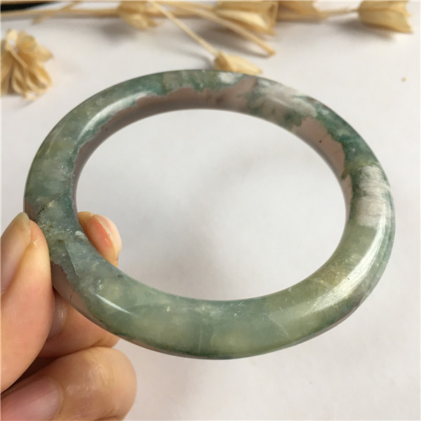 胖圓條。冰潤淺灰色底,半壁綠葉白牡丹。有冰紋無摳感完全不影響,有小沙眼。送鐲心。