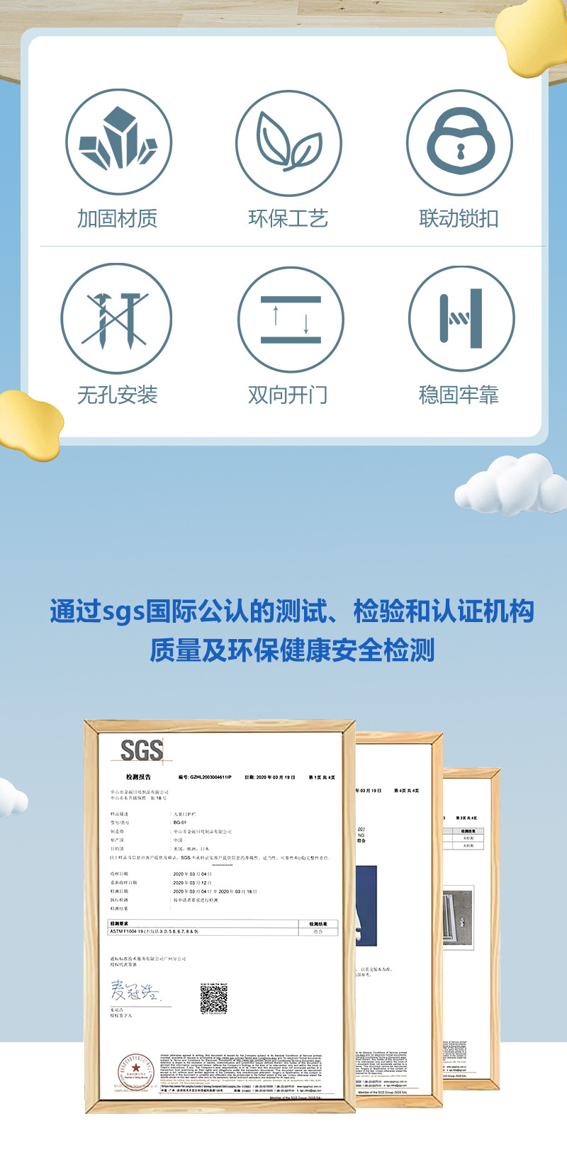 2.雙重開關,成人單手秒開(一鍵開啟)3歲以下兒童打不開(有防誤開裝置,無需提起)。 3.無需打孔,簡易拆裝