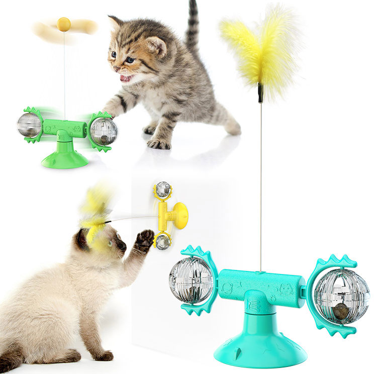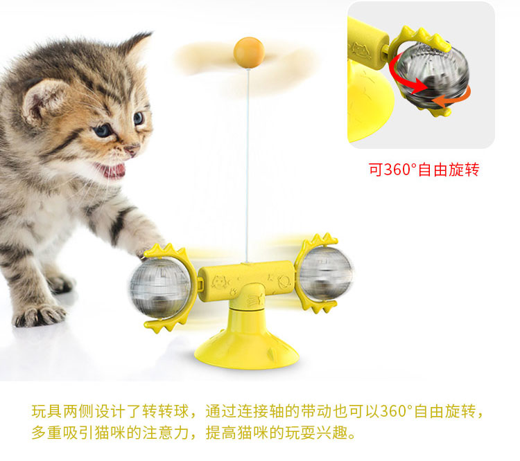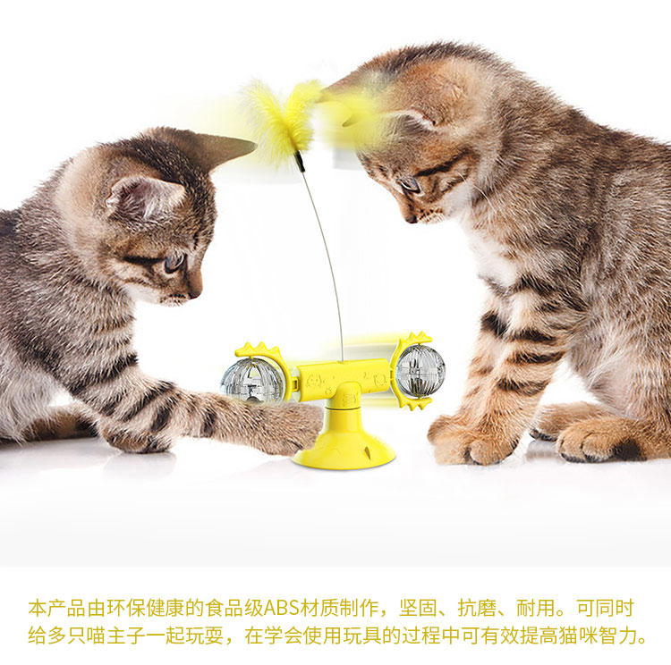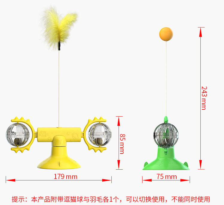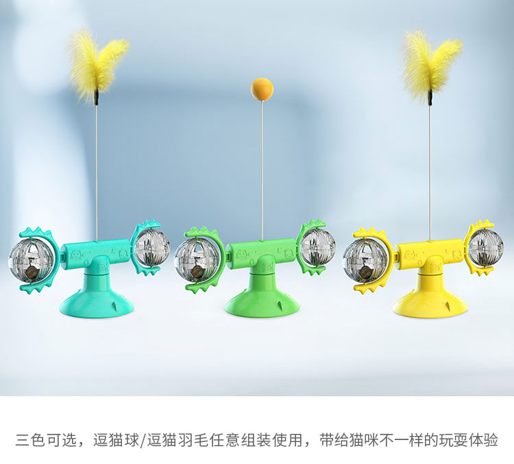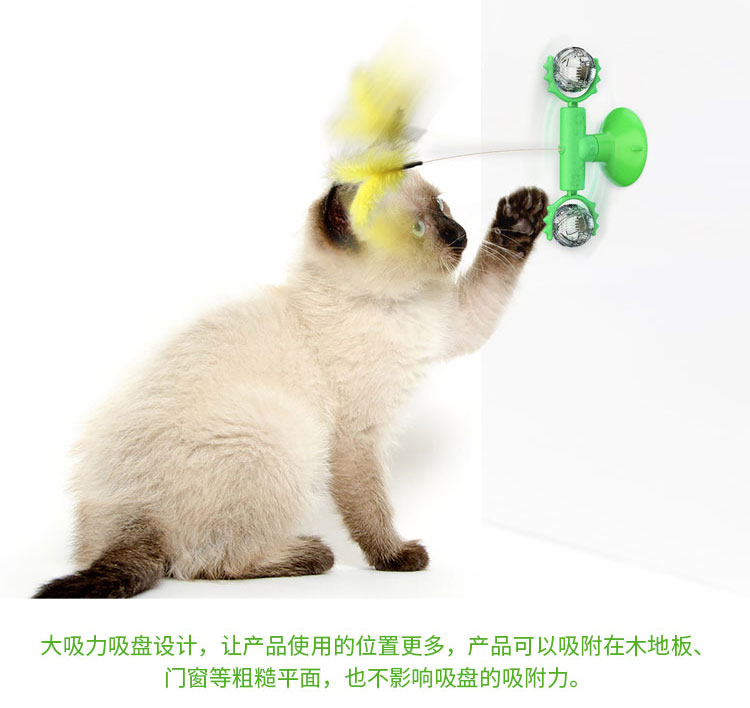 底部吸盤設計,可以固定在平面或者豎面使用,玩具主體可以轉動吸引貓咪的玩耍,主體兩側的轉轉球也可360度轉動,透明的轉轉球為鏤空透氣設計,內含貓薄荷球,頂部具有彈性的逗貓球桿或者羽毛來吸引貓咪的興趣。