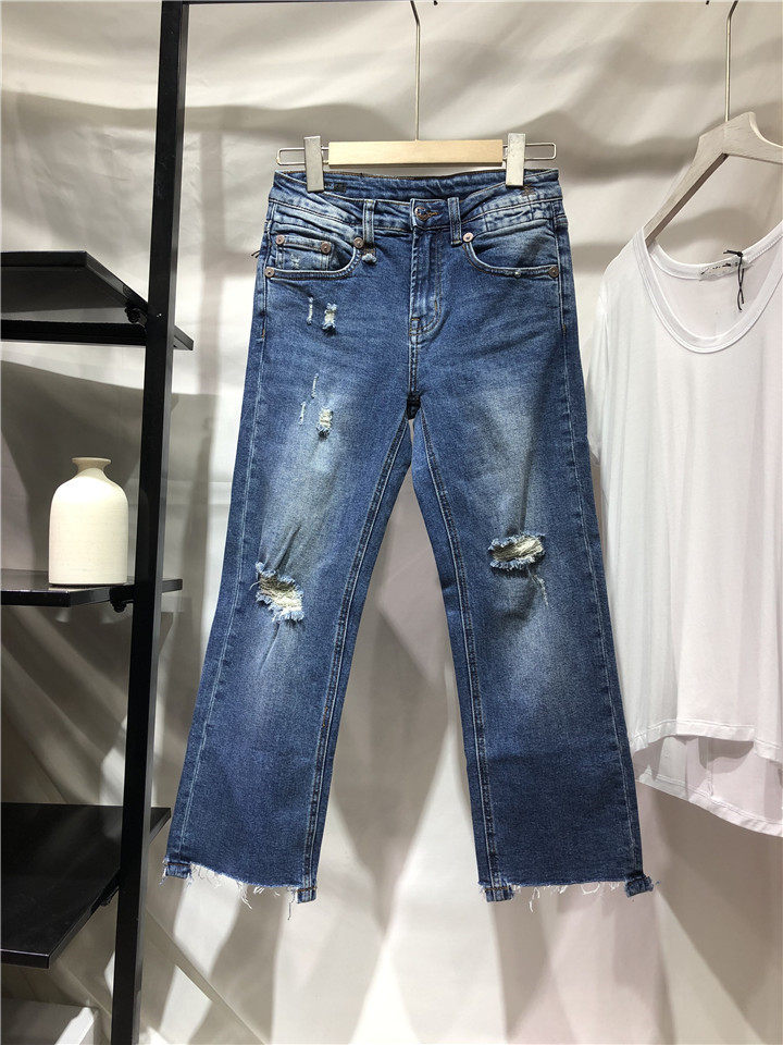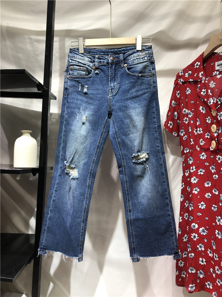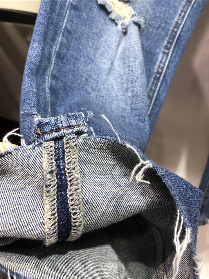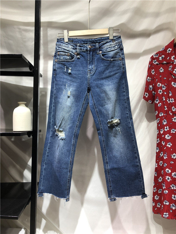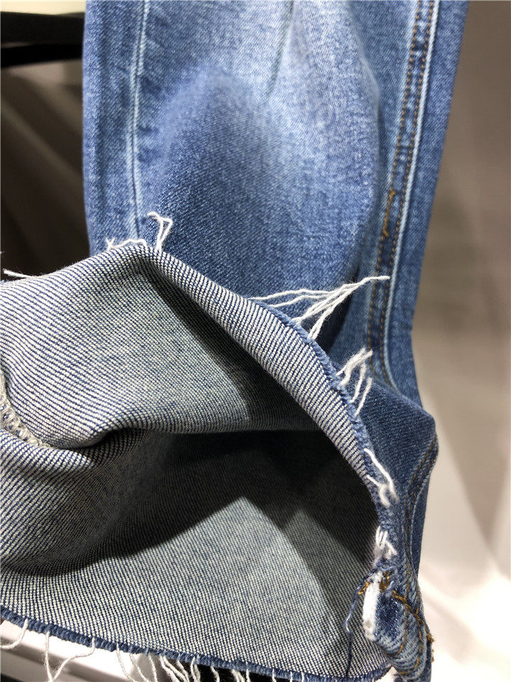 歐單精品牛仔褲。貿易公司訂單多余,水洗湛藍色中腰的,7~8分褲長, 不是很硬的牛仔,手感常規偏軟。很好的上身舒適度,破洞毛邊小直筒牛仔褲,褲腳不對稱的設計,雙膝小破洞,褲腳毛邊細節非常帥氣的一款。上身露出腳踝,特別適合夏天的天氣穿著,秋天和春天也很好搭配。面料有微彈性,褲腰的彈性不是很大。做工細節品相贊。好的版型,好的做工,推薦入~剪標發貨~