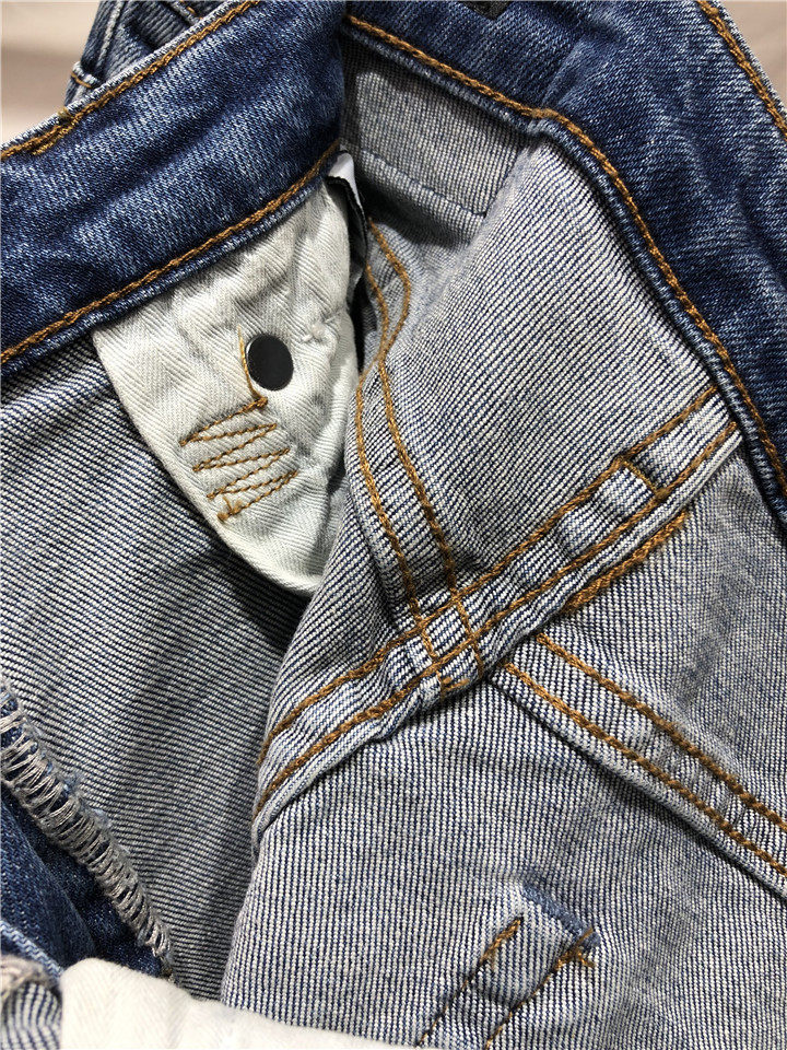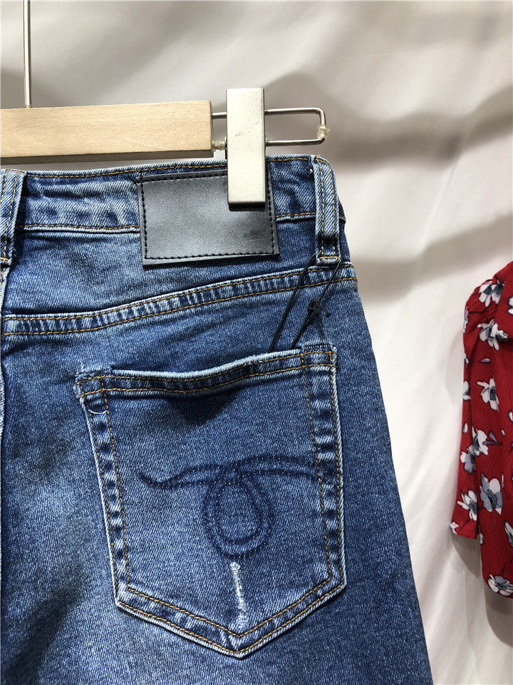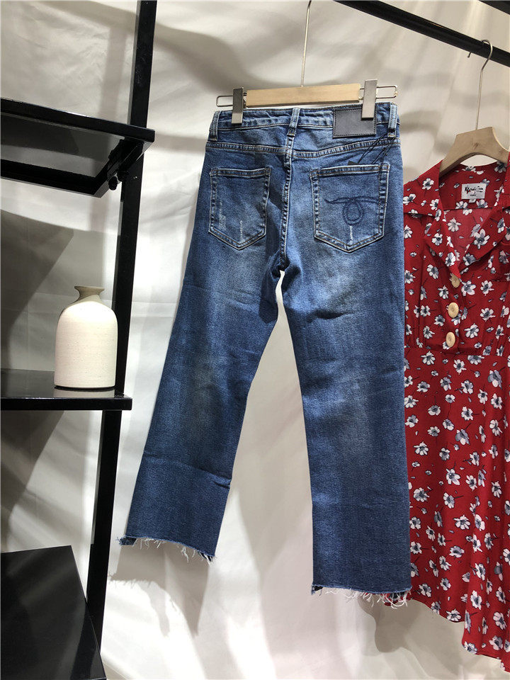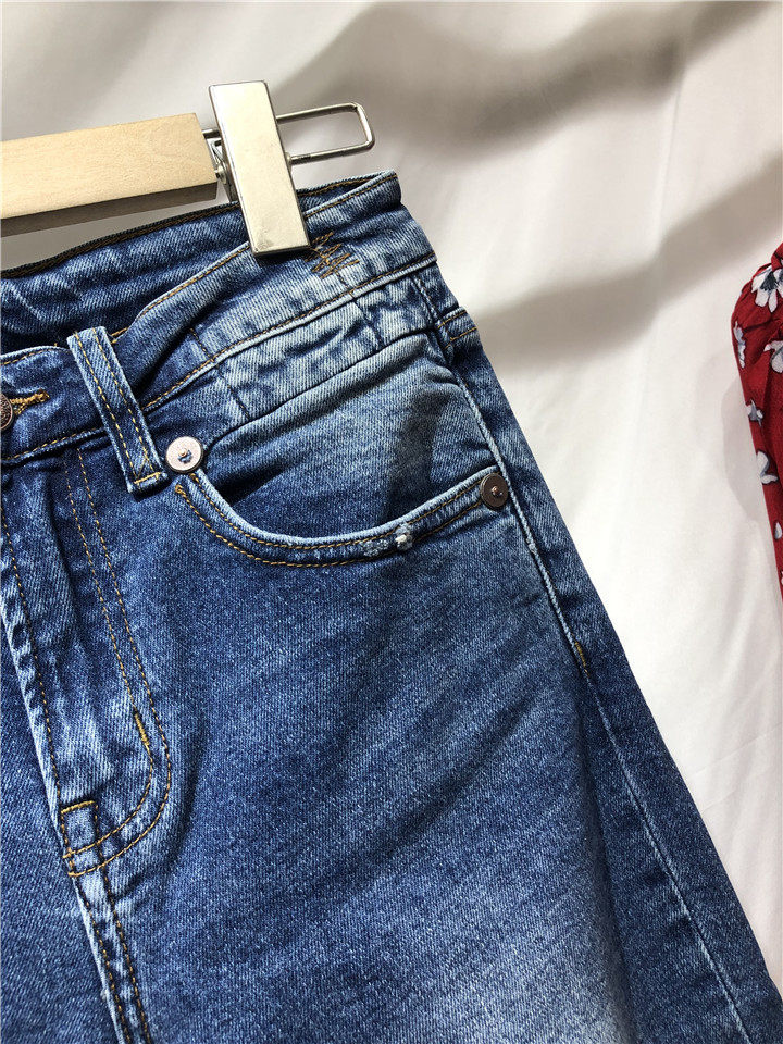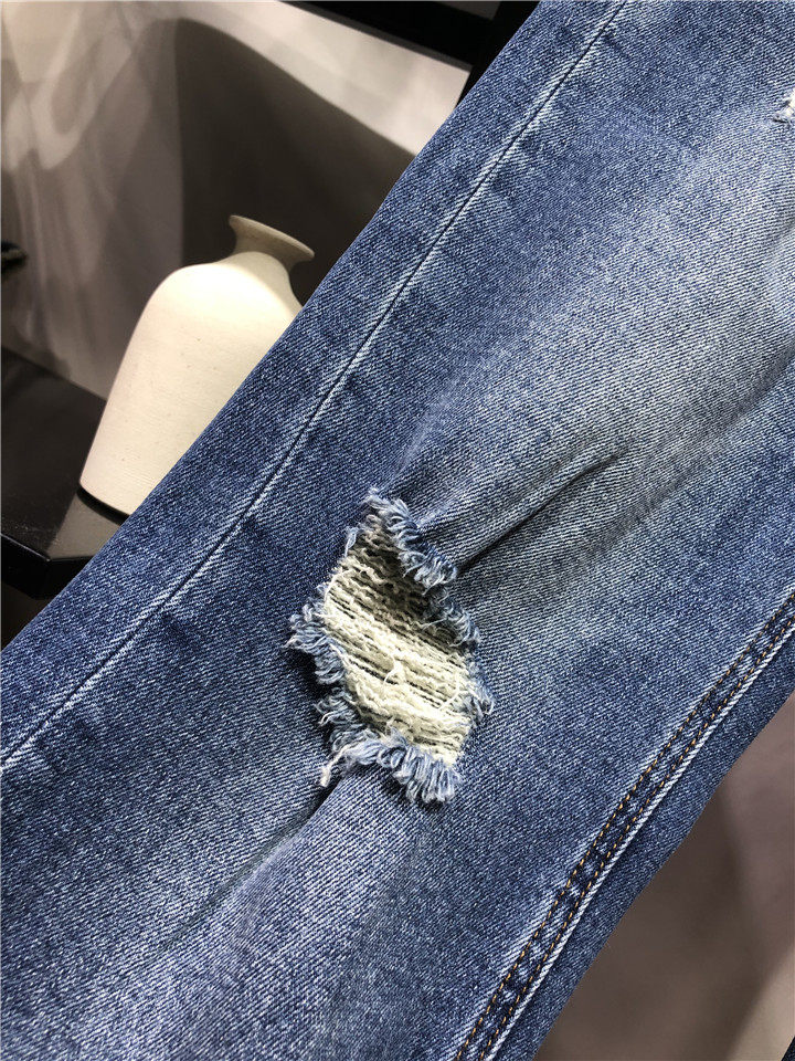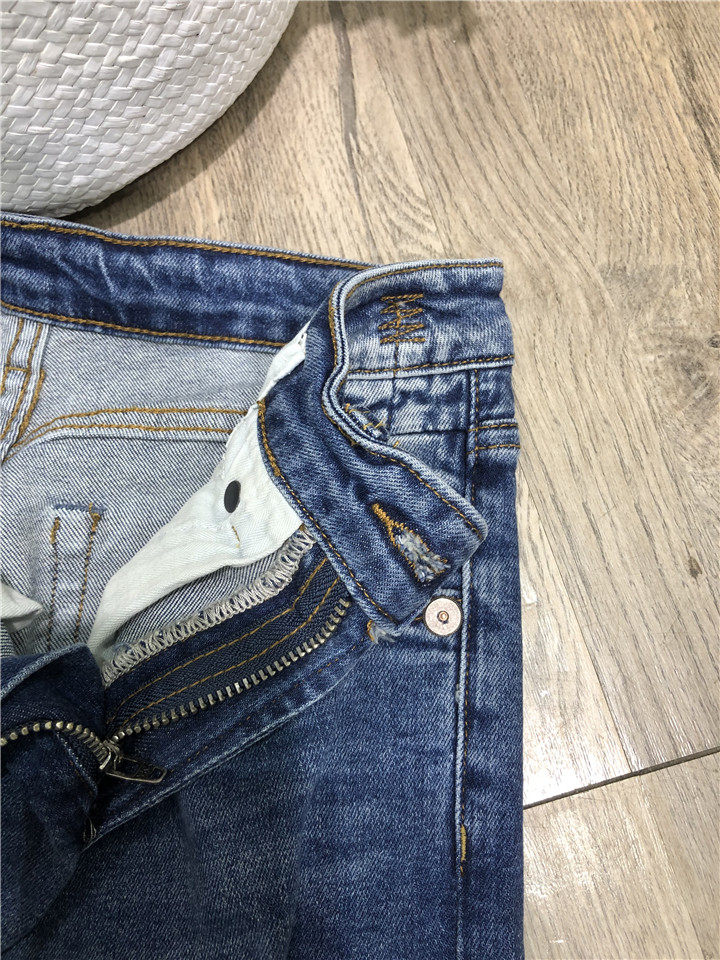 歐單精品牛仔褲。貿易公司訂單多余,水洗湛藍色中腰的,7~8分褲長, 不是很硬的牛仔,手感常規偏軟。很好的上身舒適度,破洞毛邊小直筒牛仔褲,褲腳不對稱的設計,雙膝小破洞,褲腳毛邊細節非常帥氣的一款。上身露出腳踝,特別適合夏天的天氣穿著,秋天和春天也很好搭配。面料有微彈性,褲腰的彈性不是很大。做工細節品相贊。好的版型,好的做工,推薦入~剪標發貨~