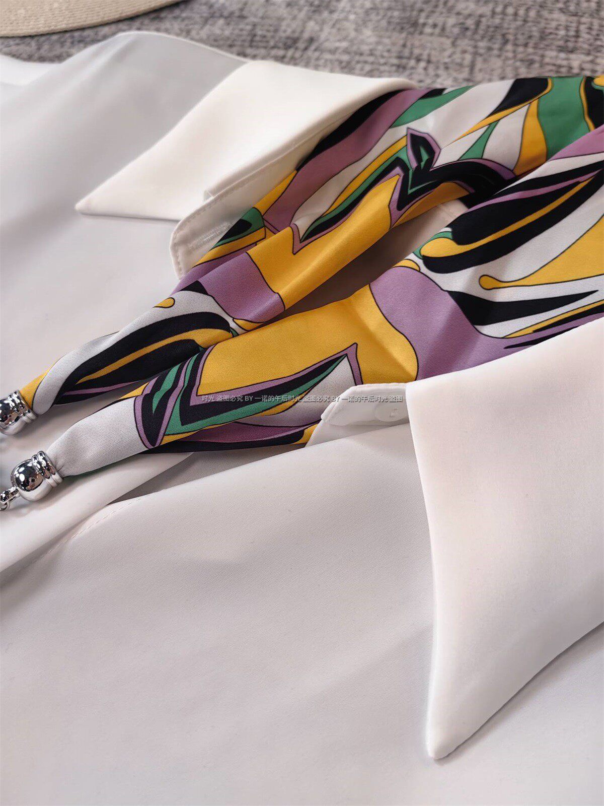 這件白色短袖襯衫+花色絲帶