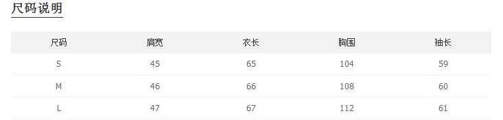應季新款! 應季新款!S 肩寬 45 衣長65 胸圍98 袖長59M 肩寬 46 衣長66 胸圍102 袖長60L 肩寬 47 衣長67 胸圍106 袖長61XL 肩寬 48 衣長68 胸圍110 袖長62尺寸手工測量,1~3cm誤差屬正常哦