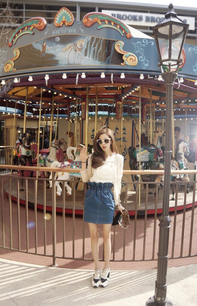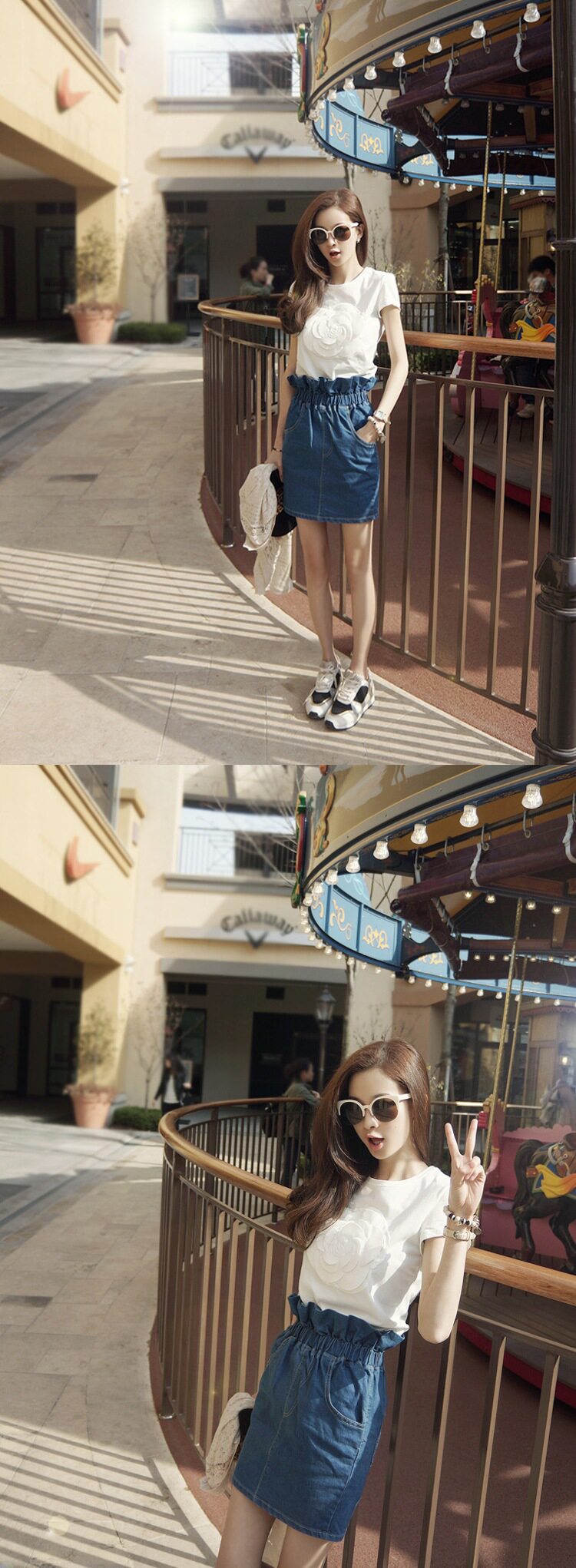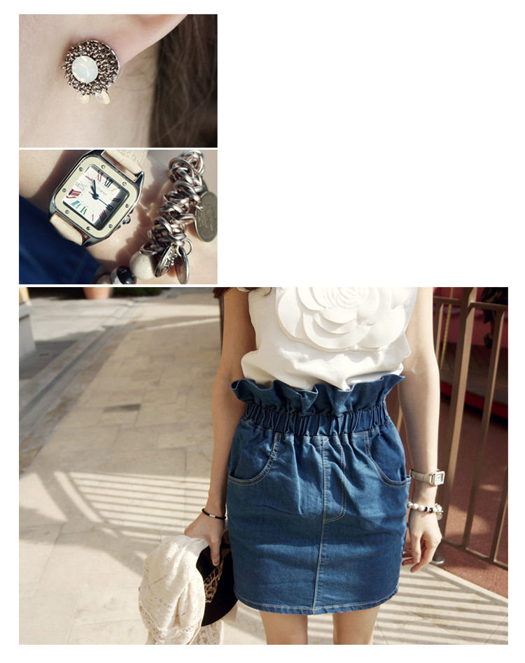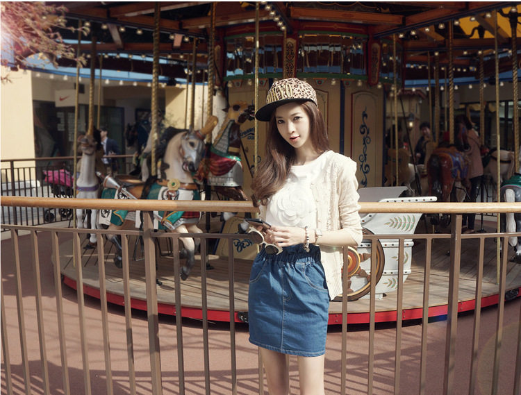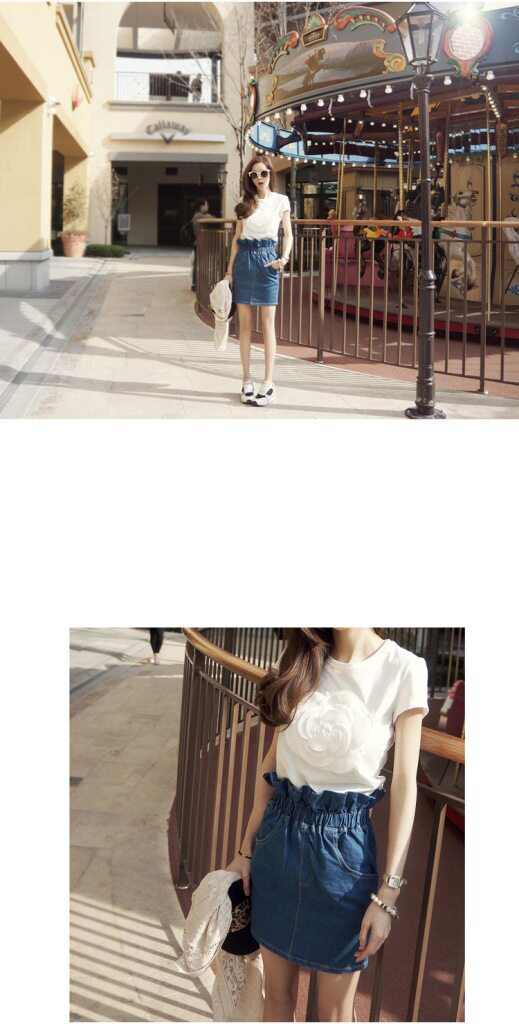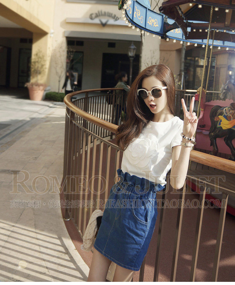 繡花立體山茶花純棉T恤,高雅時尚!可搭配任何下裝。水洗深藍牛仔包臀裙, 松緊高腰的款式,好版型,花苞的款式很別致 搭配T 襯衫都好看。