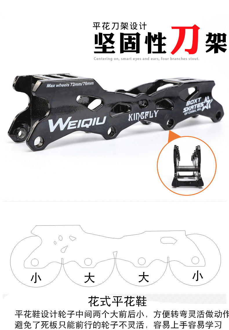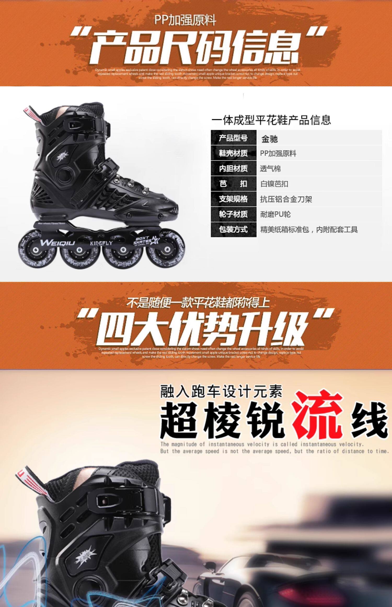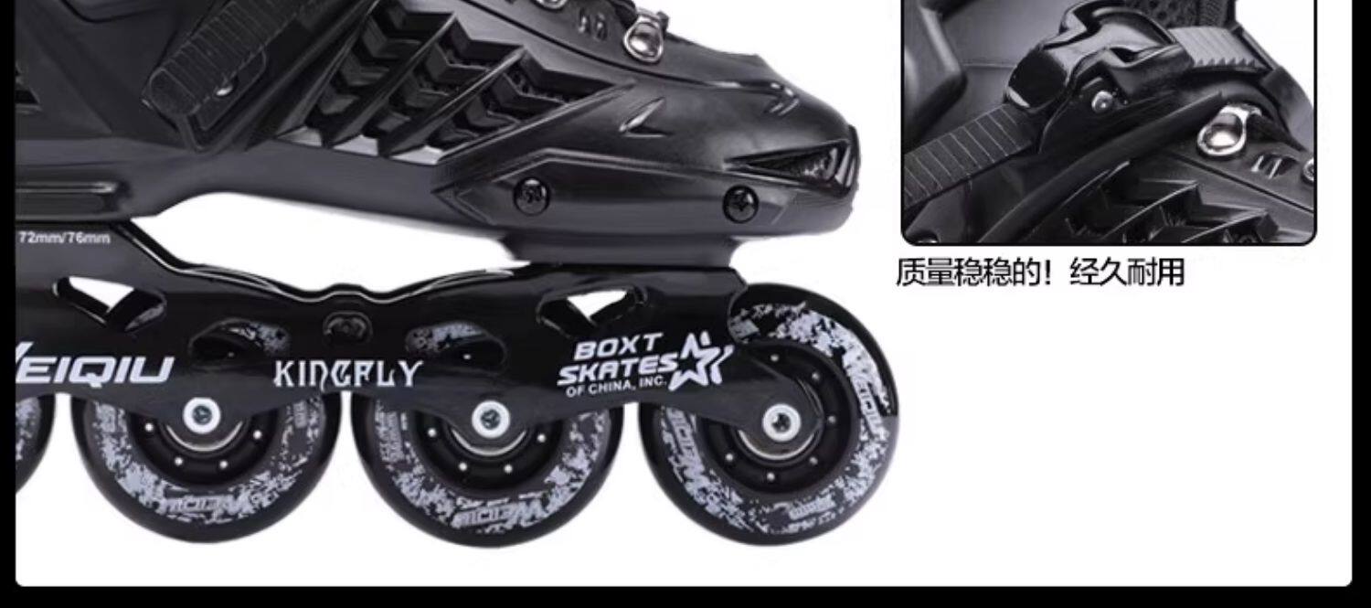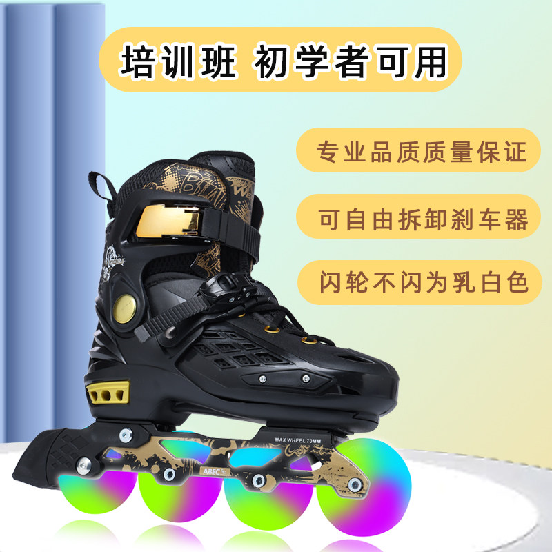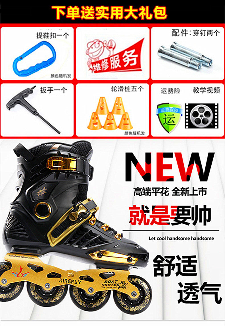 1.黑金可調款付款不閃發的是前輪閃光請知曉;2.專業平花培訓班和學校都有用可放心3.固定碼數的不能調大小,原裝沒有自帶剎車器需要剎車可以購買剎車安裝4.兒童款可調碼數的有帶剎車器,剎車器可拆卸5.全閃的輪子是乳白色的輪子,固定碼數的鞋子閃光的顏色默認四種顏色搭配可調碼數的鞋子閃光輪顏色是默認四輪炫彩