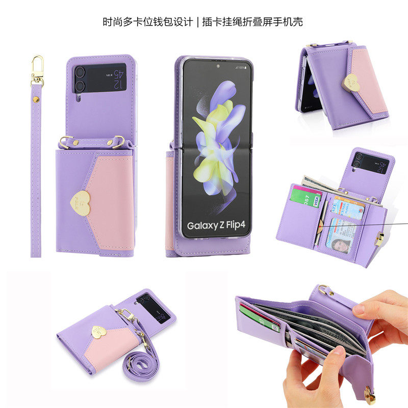 適用三星zflip4手機殼flip3殼Samsung z flip4 case錢包皮套收納包摺疊機斜挎背帶拼色愛心w23flip電話放卡殼galaxy cover