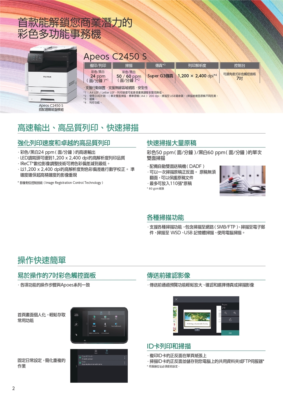*2:使用DADF時。(單次雙面掃描。標準原稿(A4)、200 dpi、掃描至USB隨身碟。)掃描速度因原稿不同而異。