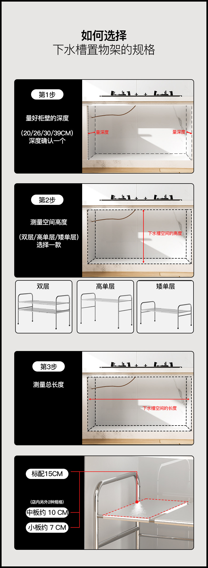 本款長度可以拉伸。長度有33--120厘米不等,還可以定制;不銹鋼板尺寸是約15厘米,另有10、7厘米小板;層高可以調節;寬度有20、26、30、39,約49厘米5種;親可以提供尺寸,由客服給您選好合適的種類。