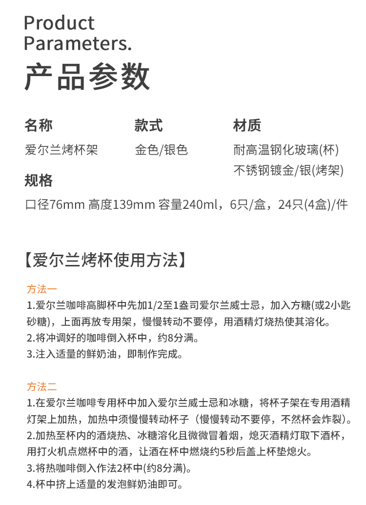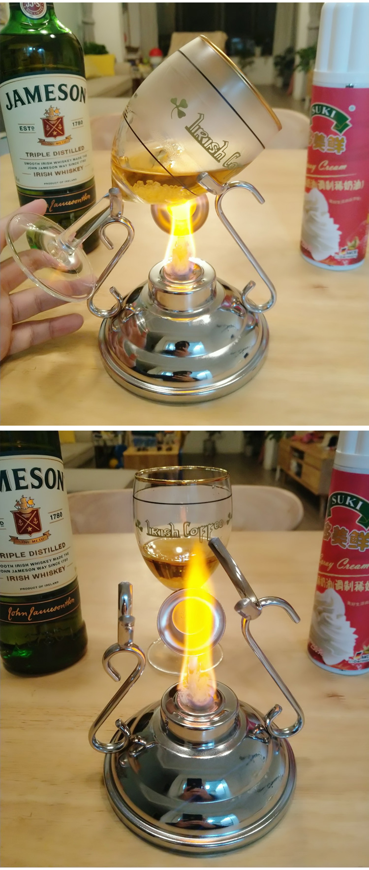 2、半盎司威士忌、一小咖啡匙的糖(以冰糖或咖啡糖為佳)加入愛爾蘭咖啡中烤杯。