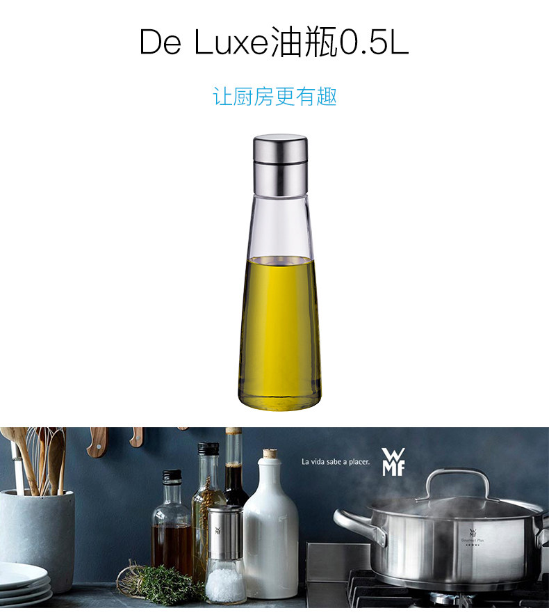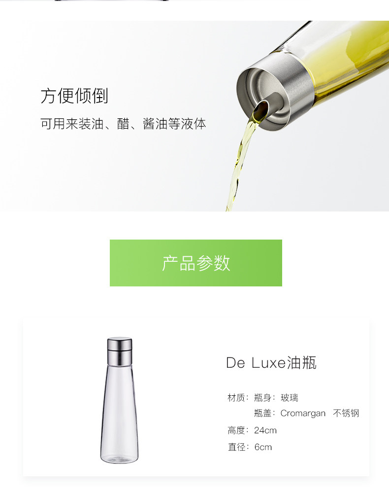 特點:大口直徑,方便油的倒入;帶油嘴回流,不會弄臟瓶身和桌面;500ml大容量,造型美觀高雅。