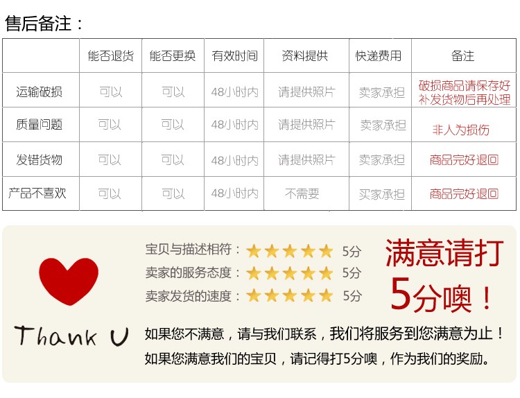 1. 收到貨的時候,請先清點收到的貨品,對照一下是不是自己購買的物品,如果發現有破損,請寫明原因拒絕簽收快遞單,讓送貨快遞員原單退回。賣家可以向快遞索賠,一旦買家已經簽收快遞,賣家也失去了和快遞協商的權利,希望買家理解和支持哦。如買家不檢查就簽收,視為對產品外觀質量和貨物數量無疑義,本店概不負責因簽收后產品外觀質量問題和貨物數量差異所產生的退換,希望大家做好簽收檢查工作以免帶來不必要的麻煩。本店保留解釋權利。