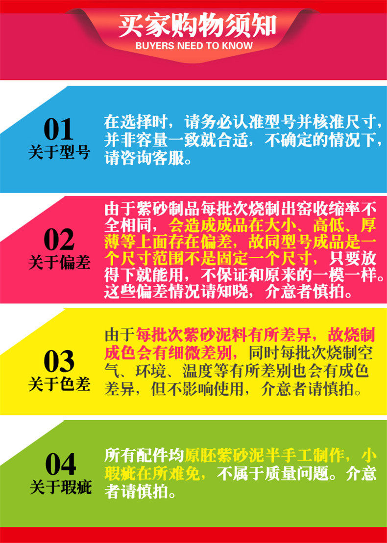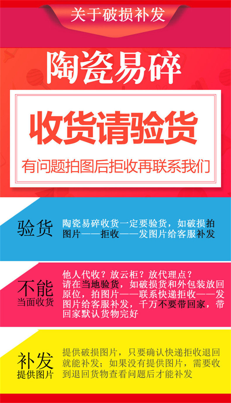6、陶瓷制品屬于工藝品,經幾十道工序燒制形成,由于制造流程復雜,可能出現輕微小瑕疵、不平、小黑點、小孔的現象,顏色是根據當時制作時瓷土、天氣、燒制放置位置有關,大小、高低、厚薄上也有小偏差,不是質量問題,屬于正常現象,要求高的請慎拍。