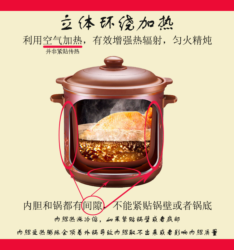 1、內膽不能在煤氣爐、電陶爐等爐灶上使用,只能在原型號電燉鍋里面使用。