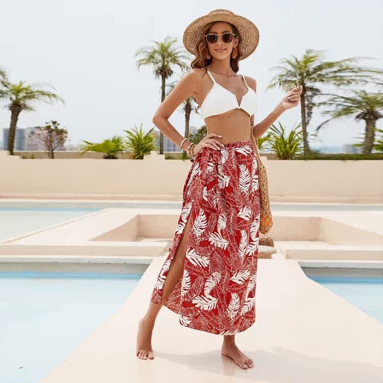 2023夏季歐美風沙灘度假雪紡印花扎染綁帶沙灘裹裙罩衫舒適面料