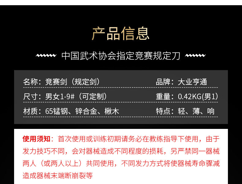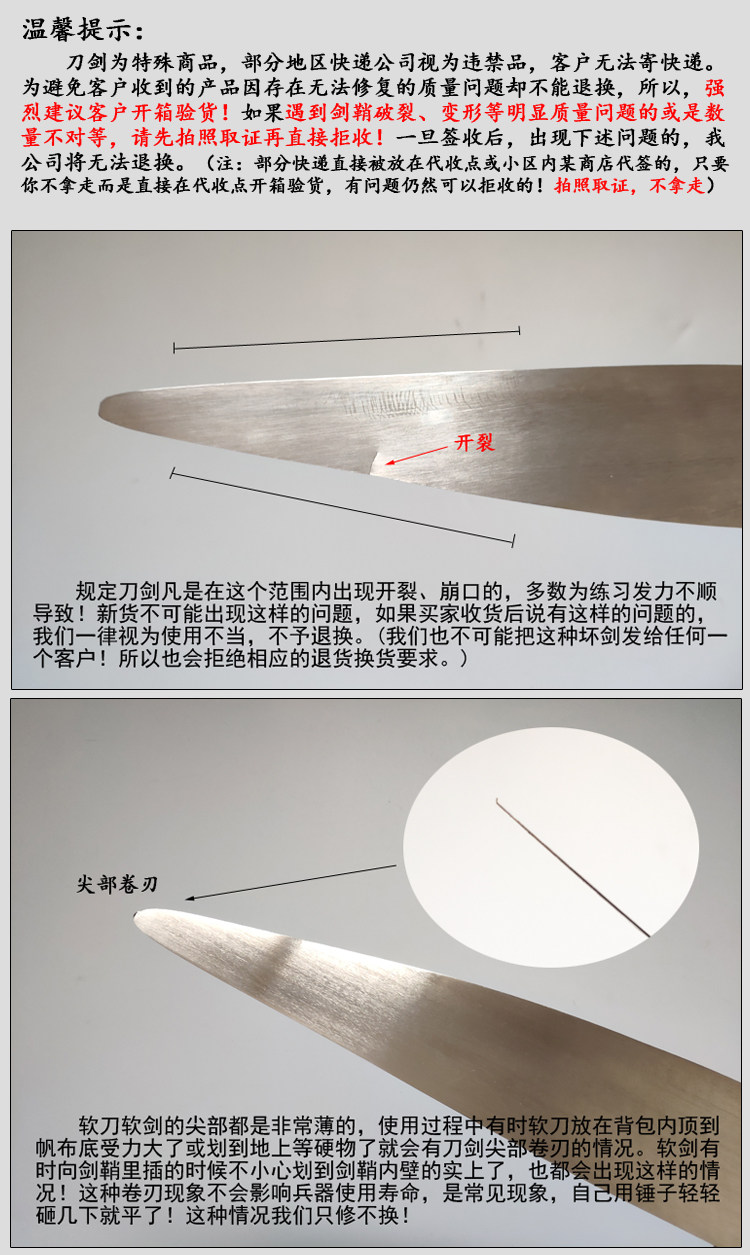 刀劍兵器類商品在發快遞時有一定的特殊性,有極少數地區快遞公司把刀劍視為違禁品,客戶無法寄回退換貨,所以在下單前一定要考慮好型號尺寸可以按客服推薦或者最好是試過相應的器械!不然買家無法退貨,我們是不承擔任何責任的!