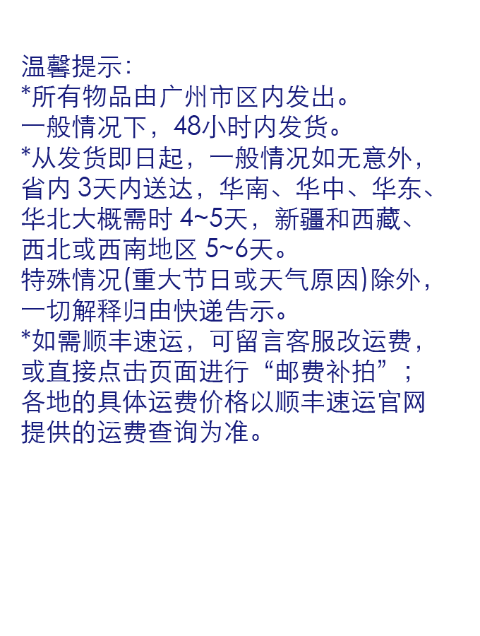 訂單付款完成後,商品將於完成付款後翌日起算10至25個工作天內送達台灣本島,不包含海關查驗或其他不可抗力因素影響的延誤。本店不提供急件配送服務,無法因此要求取消訂單。 - 運費政策與額外收費