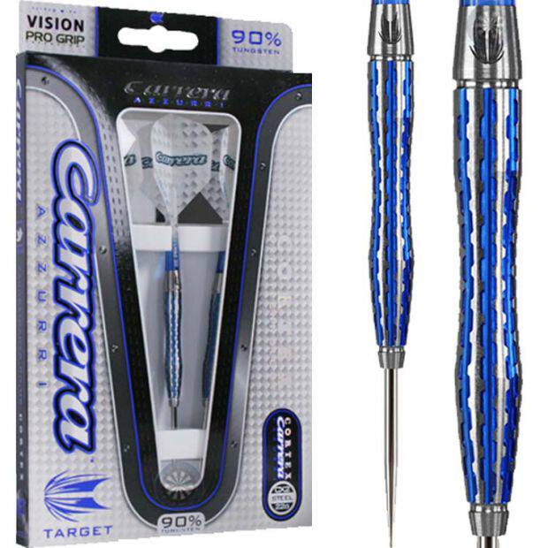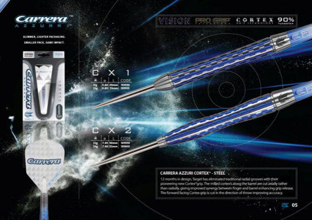 產品名稱 :鎢鋼飛鏢品 牌 :TARGET CARRERA CORTEX 系列含 量 :90%單支鏢重 :22克,24克鏢身長度 :50mm、52mm鏢身直徑 :7.05mm、7.0mm包 裝 :3支/盒(高壓泡沫包裝)配 置 :PRO GRIP鏢桿三支(帶鏢桿保護圈)、飛鏢翼三片TARGET品牌的飛鏢無論從做工還是從產品精確程度上,在眾多飛鏢品牌中都是很好的,CARRARA CORTEX 系列鏢身對稱凹槽設計,凹槽處采用藍色鍍鈦技術,使飛鏢更美觀,手感更好,握力更強