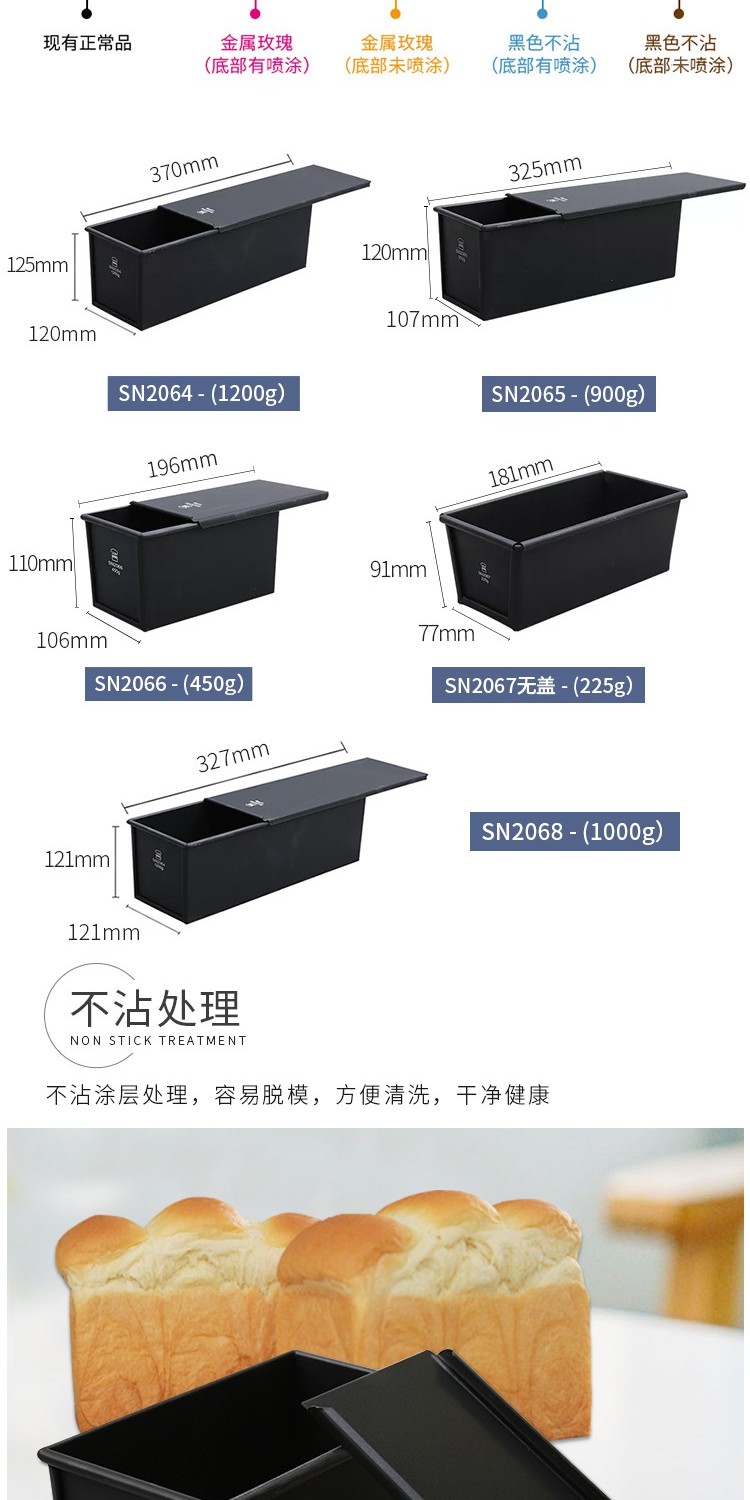 特別說明:1.本土司盒是節能款土司盒!賣點就是好上色,節省烘烤時間。請不要跟普通的金波之類的土司盒拿來比較。你會發現,這款比普通的盒子烘烤的時間短,上色很深。使用這款盒子的時候建議縮短烘烤時間,稍微降低一些溫度哦。2.本款土司盒在制作時,經由各個工藝流轉后,底部或多或少會產品刮痕,屬于正常現象,這是目前生產工藝流程限制,無法避免,本店已經在包裝時盡量小心,但劃痕在出廠時就已存在,不影響使用,介意者慎拍!3.本土司盒批次不同,經由高溫燒結后土司盒外部的顏色會有不同的差異,均屬于正常現象,但是使用效果是一樣的!4.土司盒烘烤過幾次后受熱會更好,所以使用過的盒子上色會比新盒子更好。5.初次使用土司盒的時候只需擦洗干凈即可使用。清洗后建議低溫烘干后放置在干燥處保存。