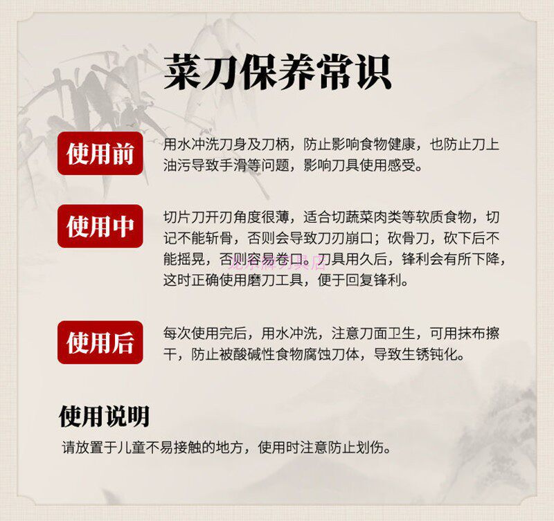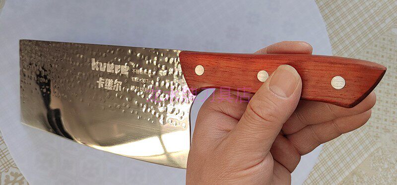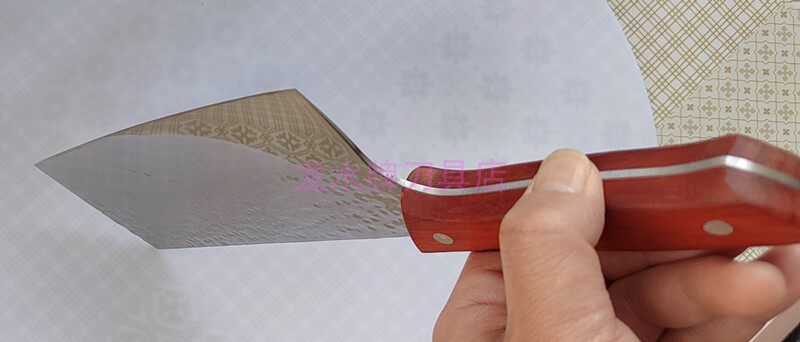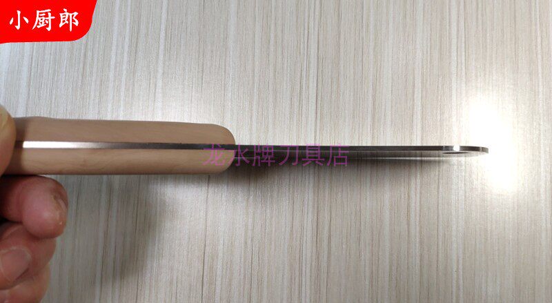 采用高檔工藝處理的薄刃設計,堅實鋒利,抗氧化力強,亦復磨,切削瓜果,蔬菜等干凈利落,同時能切出桑葉般的薄片,切勿用來砍骨頭。