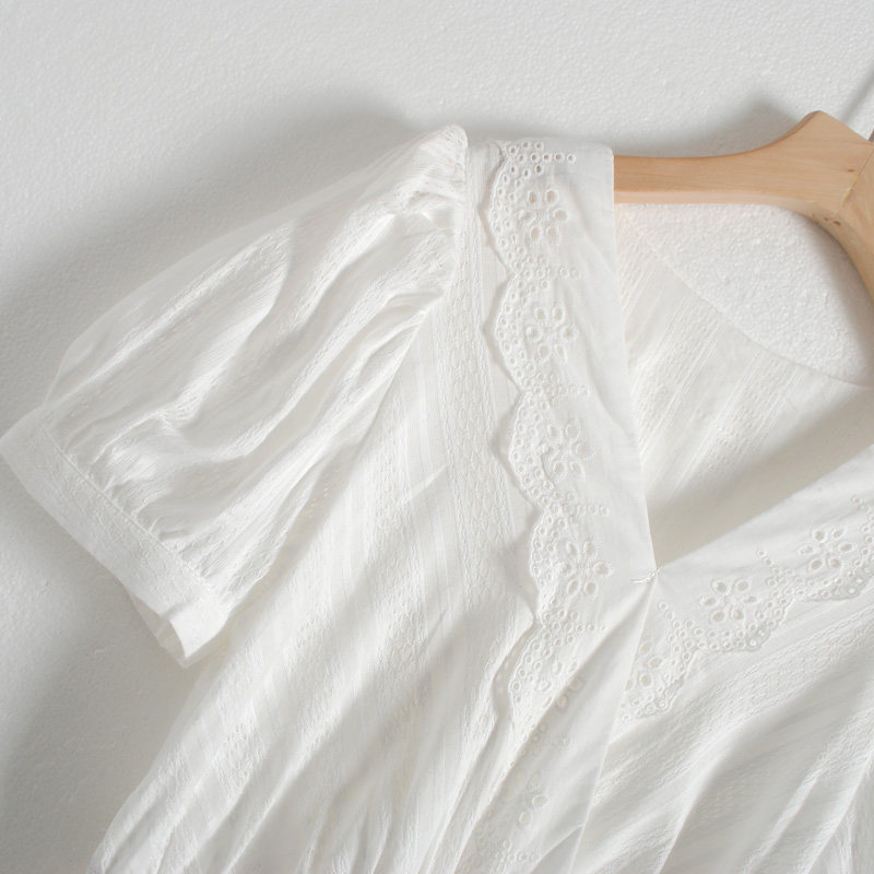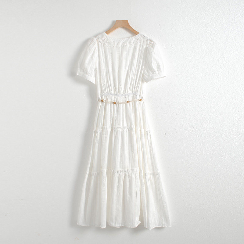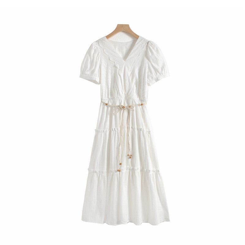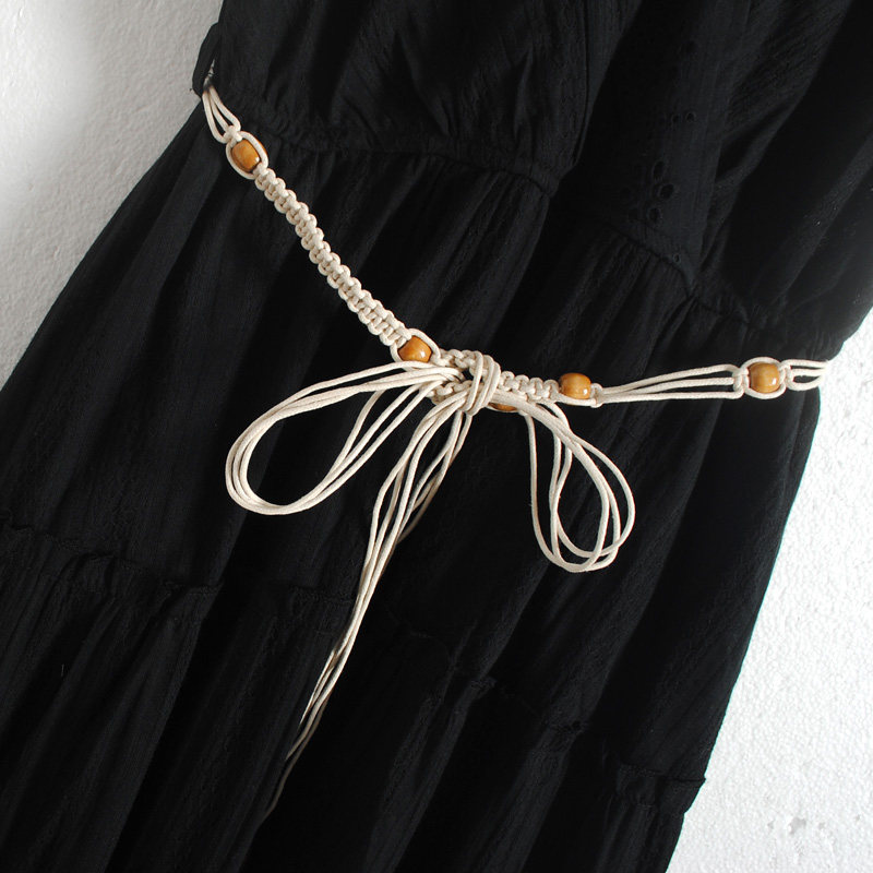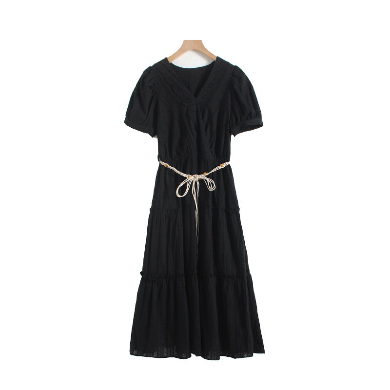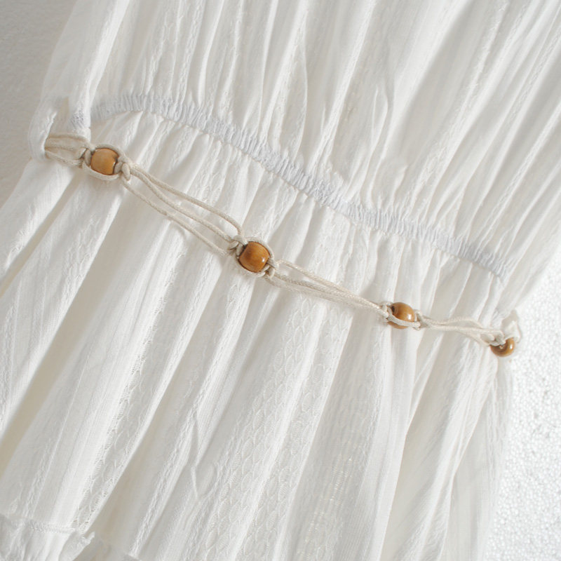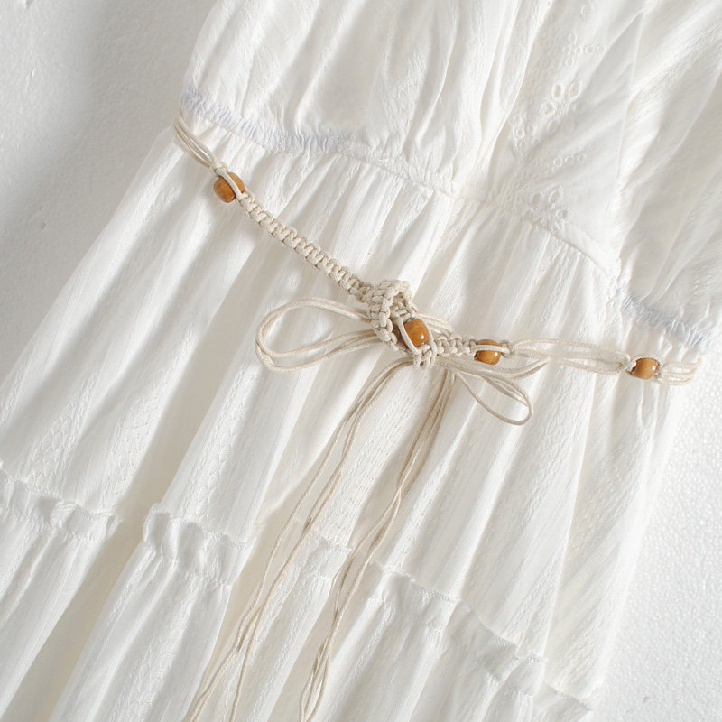 特點:度假風 V領 編織腰帶 上身微彈 松緊腰 有內襯 連衣裙