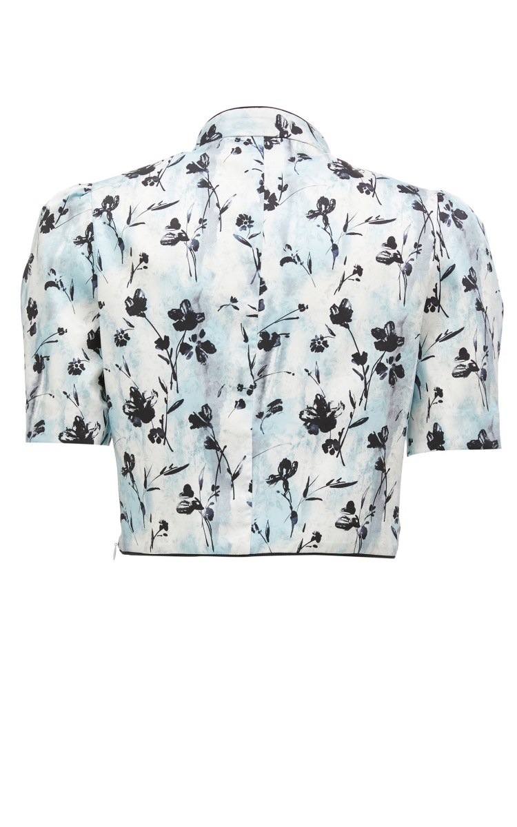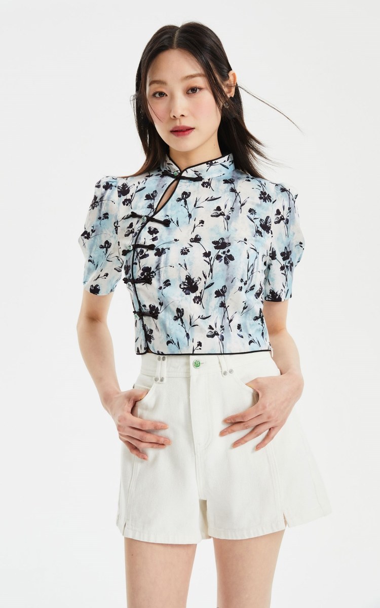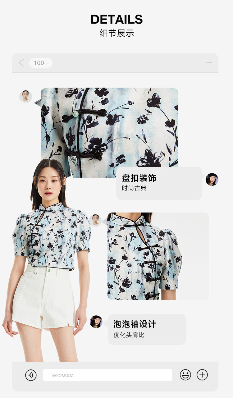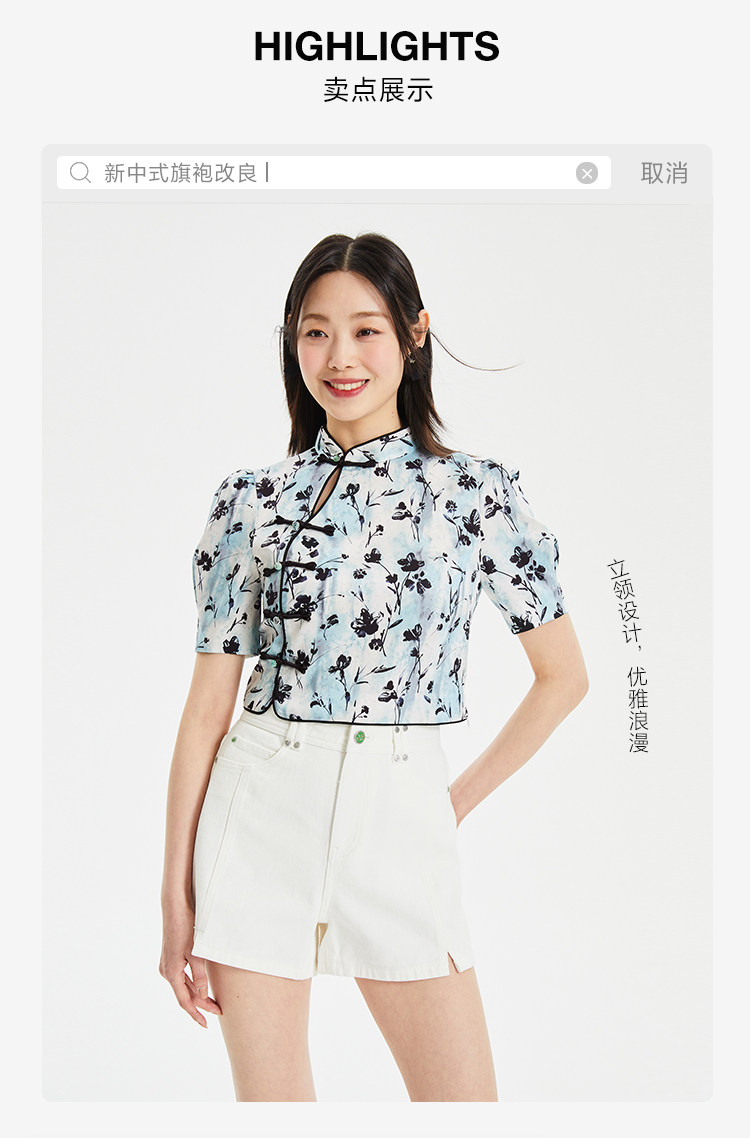 設計賣點:絲滑面料,質感滿滿;中式印花,優雅古典,盤扣裝飾,時尚古典;立領設計,優雅浪漫;后中隱形拉鏈,方便穿脫;泡泡袖設計,優化頭肩比