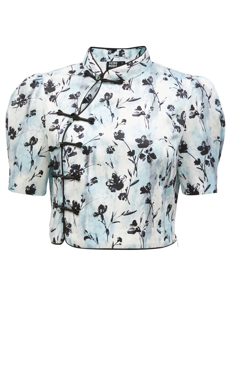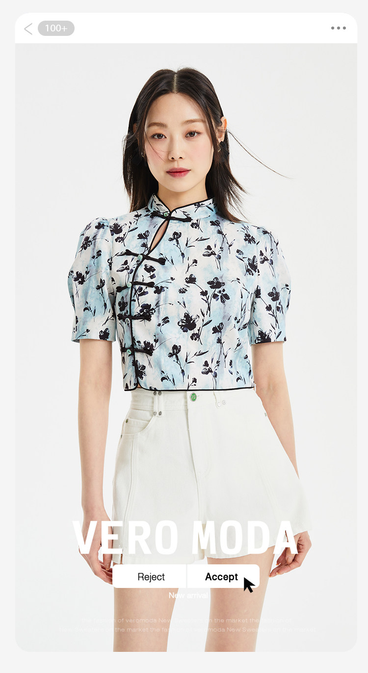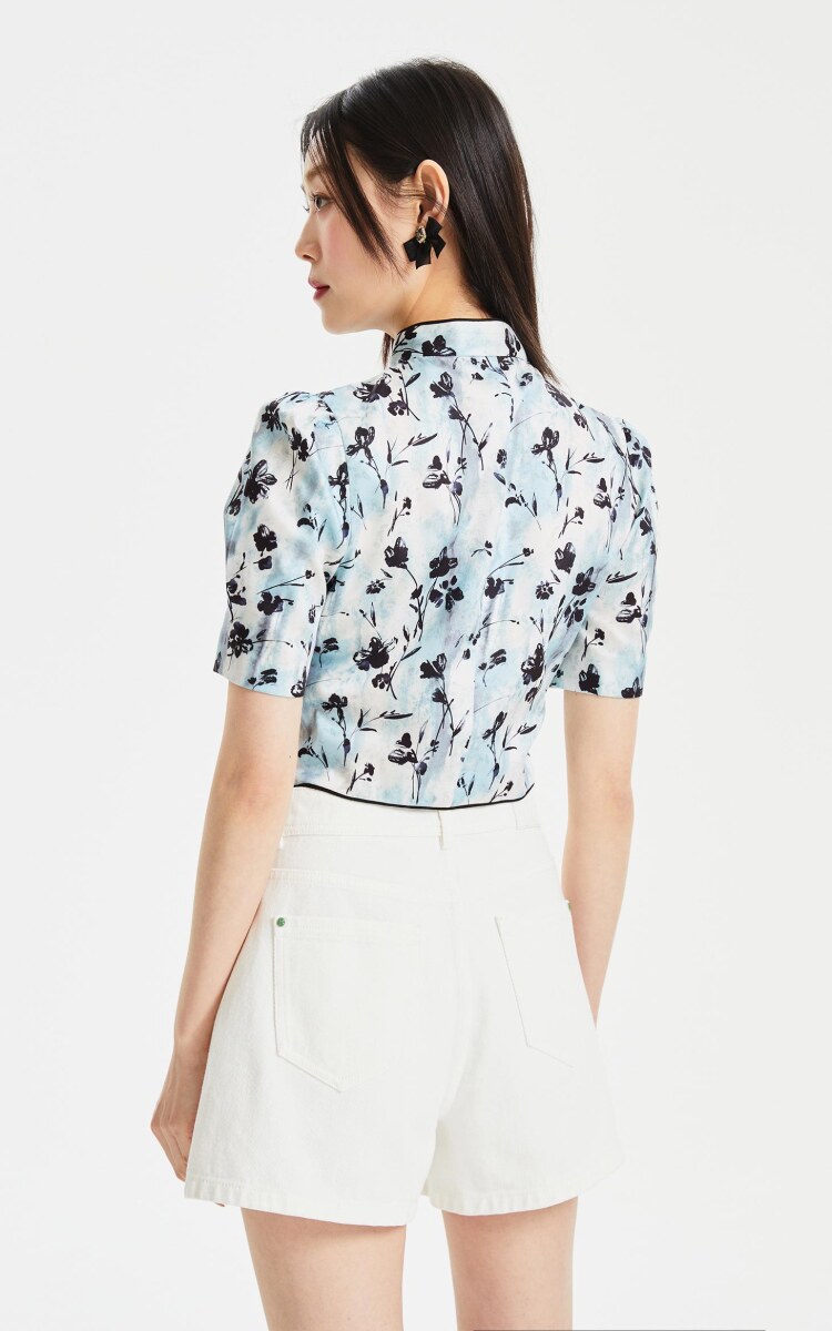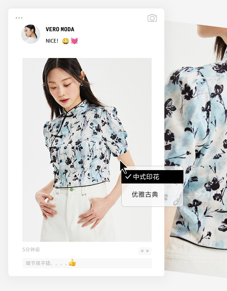 設計賣點:絲滑面料,質感滿滿;中式印花,優雅古典,盤扣裝飾,時尚古典;立領設計,優雅浪漫;后中隱形拉鏈,方便穿脫;泡泡袖設計,優化頭肩比
