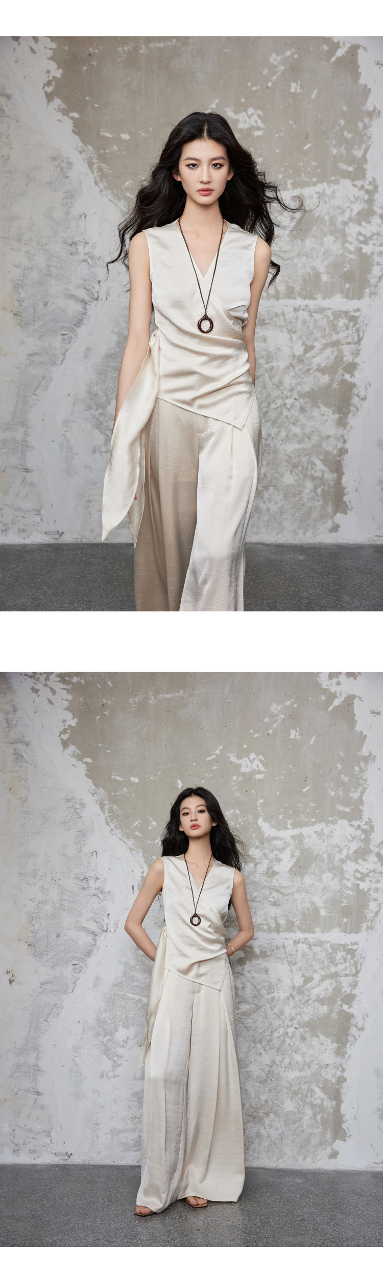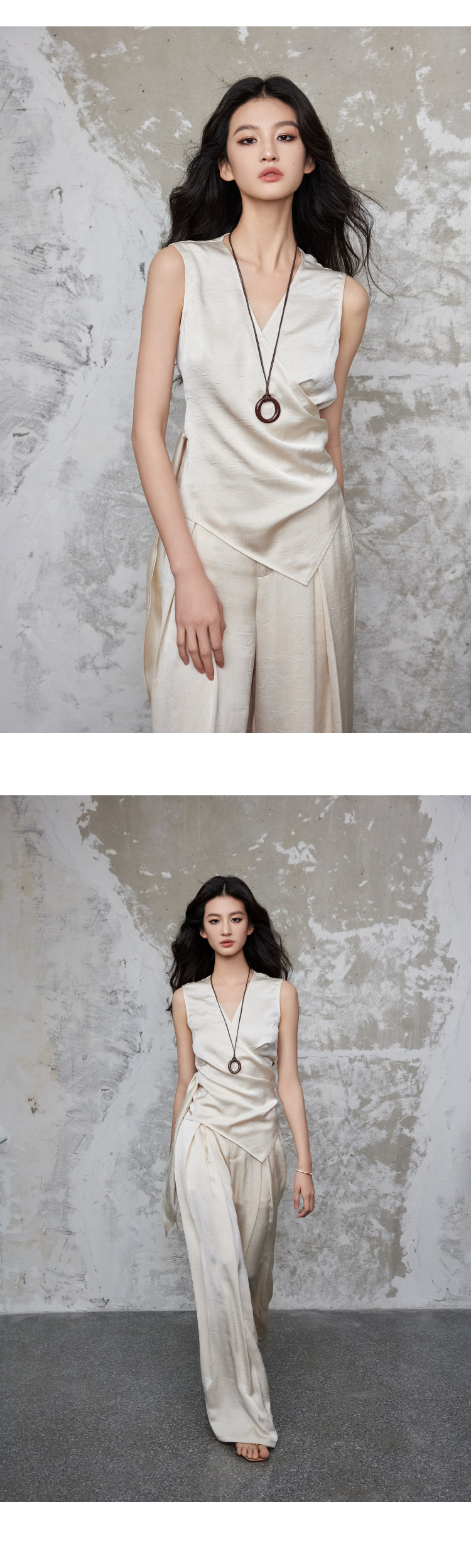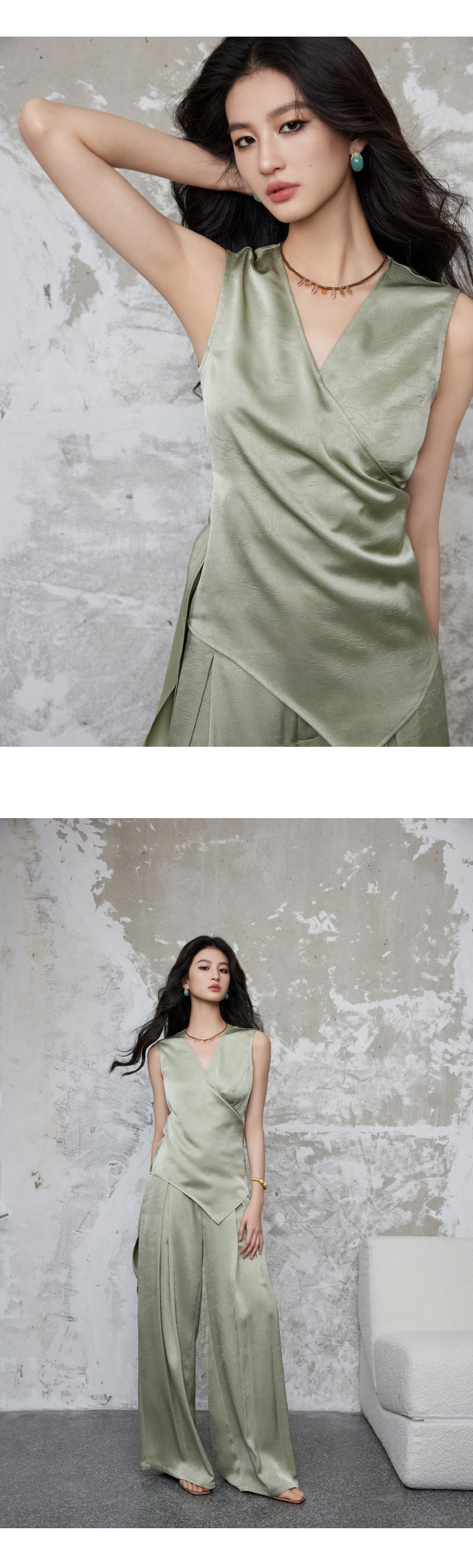 手工捏褶皺交叉疊搭形成V領,