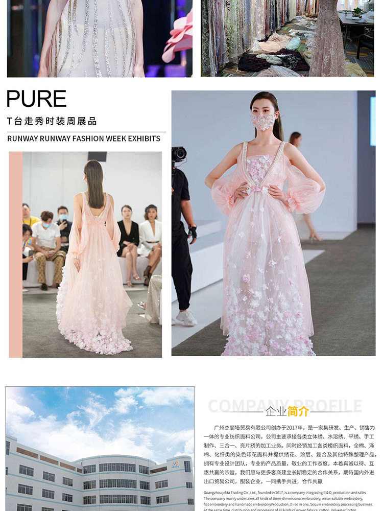 廣州杰麗塔工廠店是一家新型印染企業,生產非洲蠟染花布和蕾絲花邊面料,主要經營高中檔時裝面料,水溶繡花蕾絲面料,蕾絲花邊面料,蕾絲面料批發,以及各種底布印花,植絨,燙金等工藝加工。秉承"顧客至上,銳意進取"的經營理念,堅持"客戶第一"的原則為廣大客戶提供優質的服務,