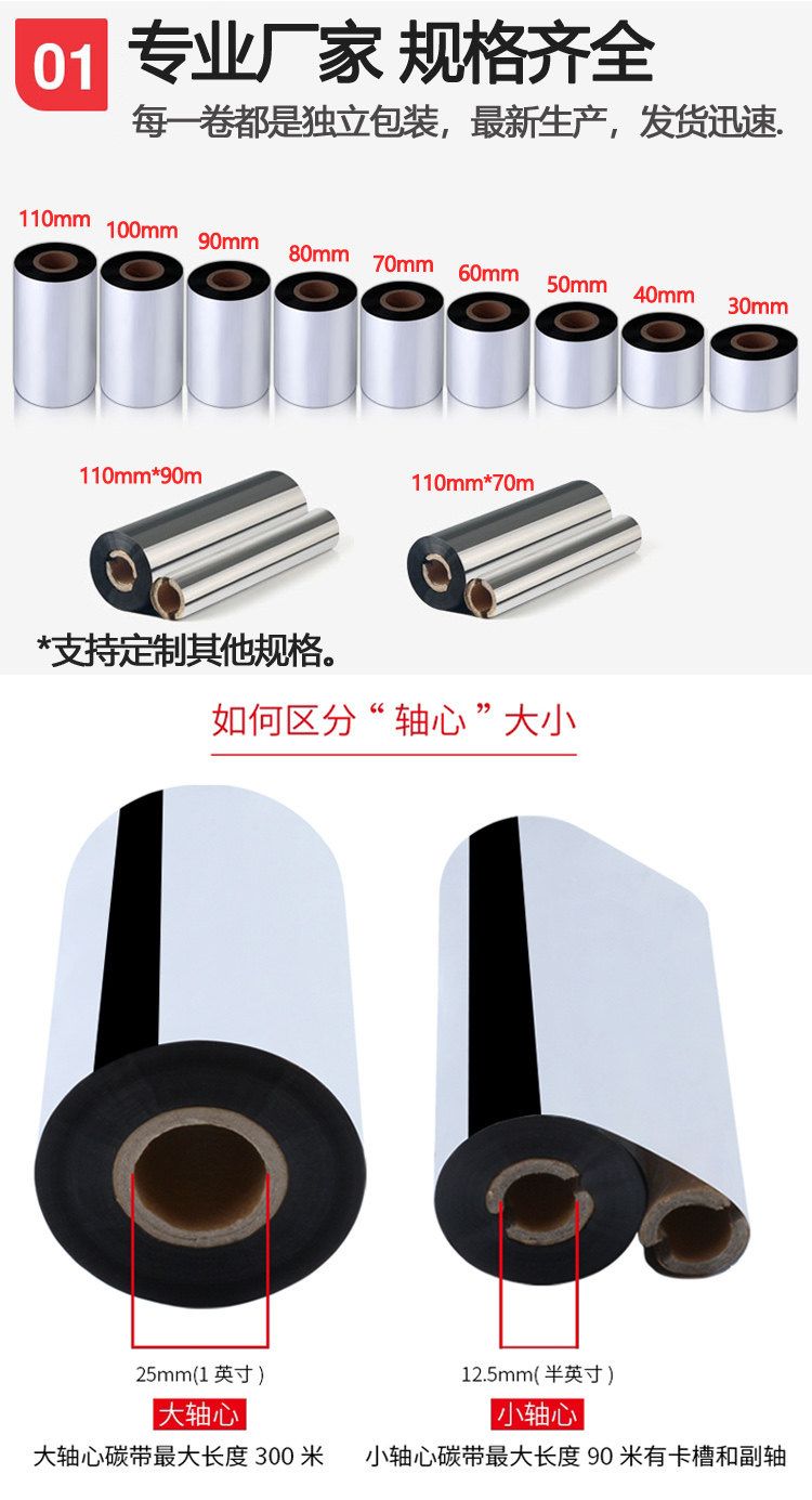 【規格】90MM*300米 1寸芯單軸大管芯【包裝】20卷/箱【產品特點】卓越的高質、高速打印性能優異的耐磨擦、耐熱、耐腐蝕、耐久性能寬廣的標簽適應范圍,能滿足各種苛刻環境要求高敏感度,確保優異的圖像打印效果防靜電背涂層,有效保護打印頭。適用于啞銀PET PVC 等混合型材質條碼紙。【適用行業】廣泛應用于電子產品、家電、汽車、化工等行業