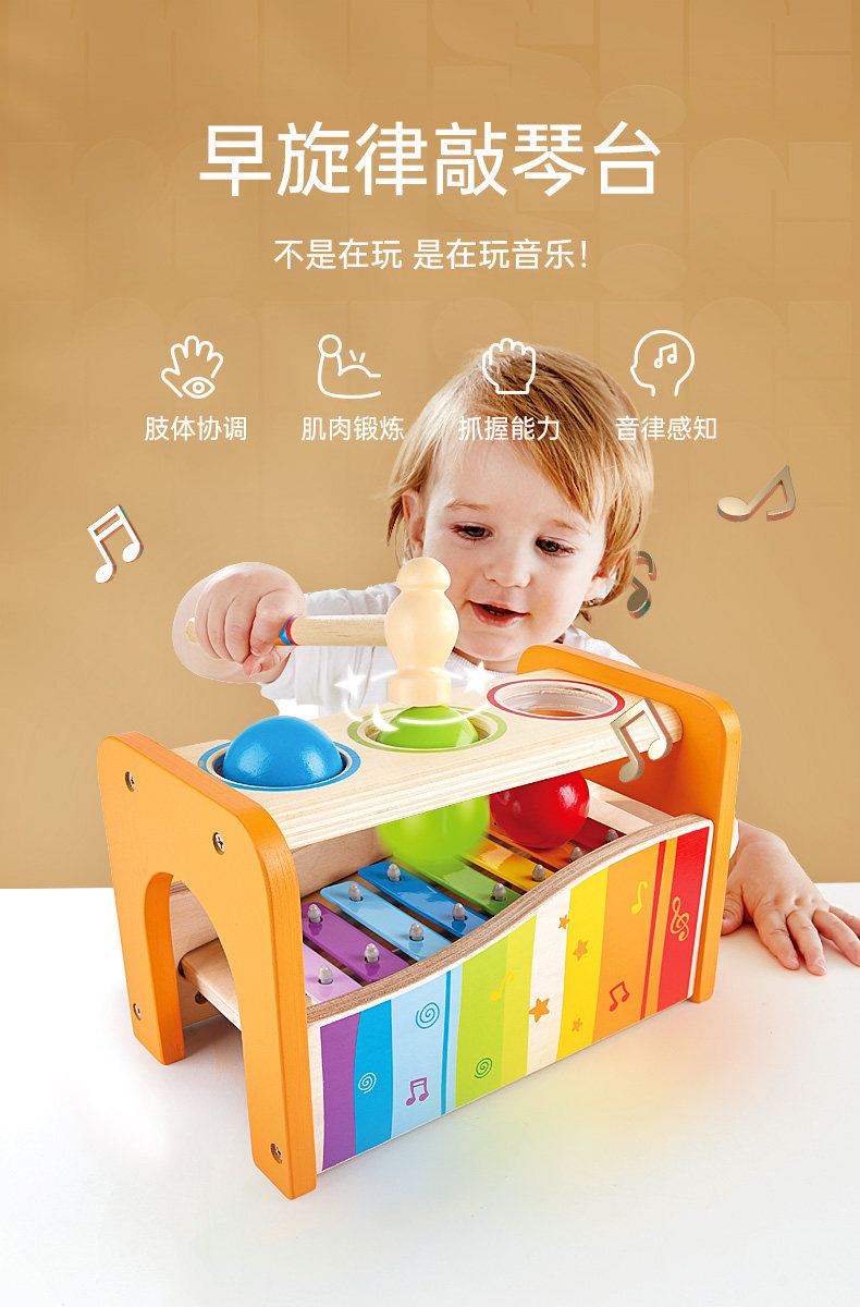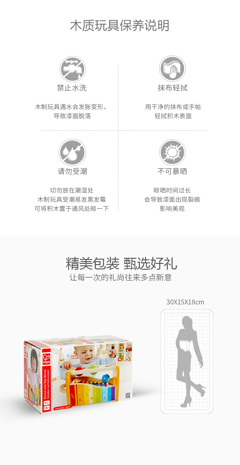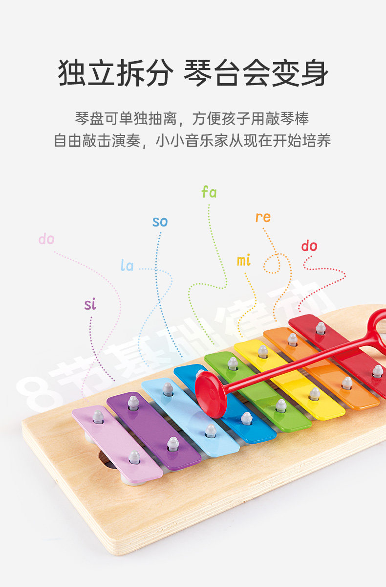 溫馨提示:Hape的這款敲琴只是玩具,主要培養樂感,不能當做樂器。因為是周歲寶寶使用,安全是主要的,所以琴鍵設計的會比較圓滑,長度也進行了限制,這些都會影響準度,并非質量問題,但是寶寶使用是沒問題的,請親們放心。