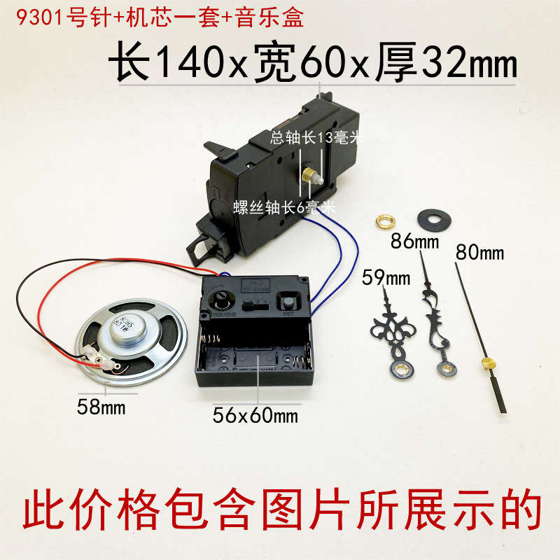 買前必看此款報時機芯螺絲軸長6毫米組合一樣,指針款式長短不一樣,可選指針,顏色分類選項只顯示指針,選擇指針拍下即可。此價格包含:機芯一個+搖擺器一個+音樂盒一個+膠墊一個+沉頭螺母一個+喇叭一個+指針一套+電池4節,不帶擺陀也就是擺錘 一定不能用南孚和勁量 金霸王 品牌的堿性電池(型號為L開頭)或者充電電池(電流大),容易造成機芯內部電路損壞,一定要用1.5V的碳性電池(型號為R開頭),東芝,雙鹿,555,華泰這些碳性電池,一般超市都有的, 看準型號購買就行,碳性電池比堿性電池便宜