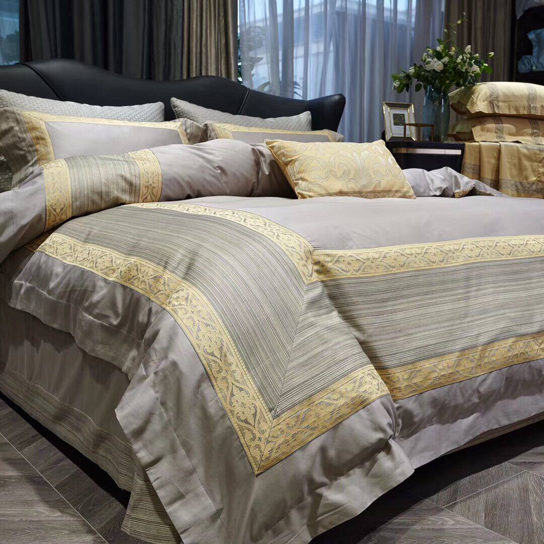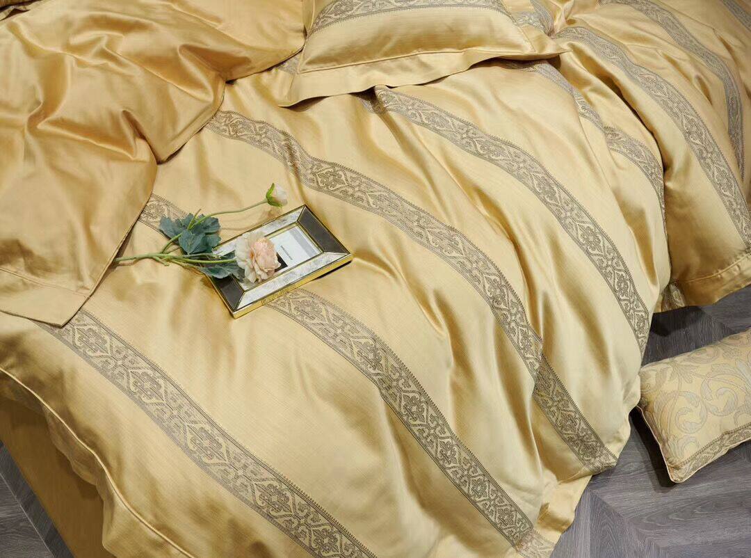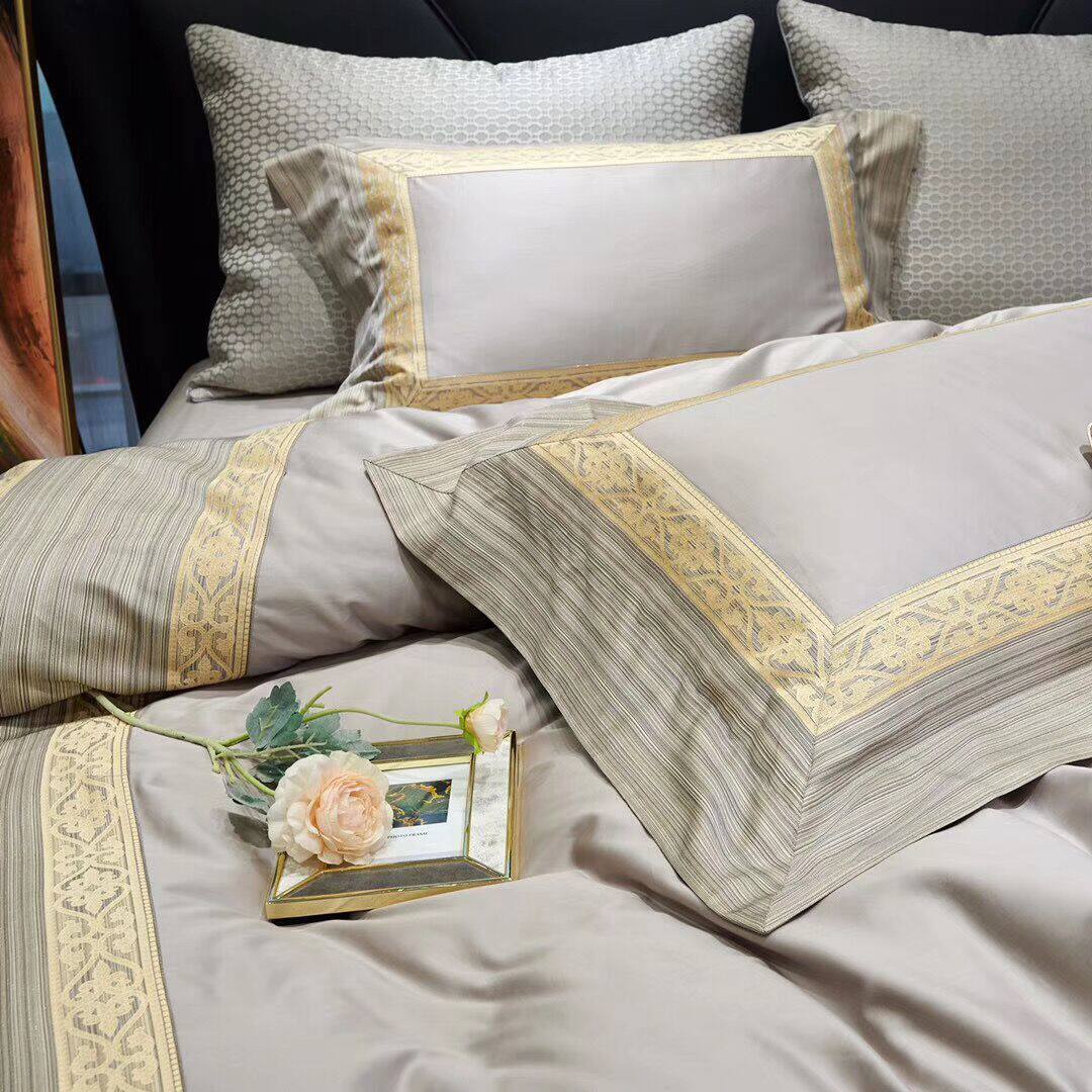 色調舒適的高端全棉搭配著立體突出的金絲提花,