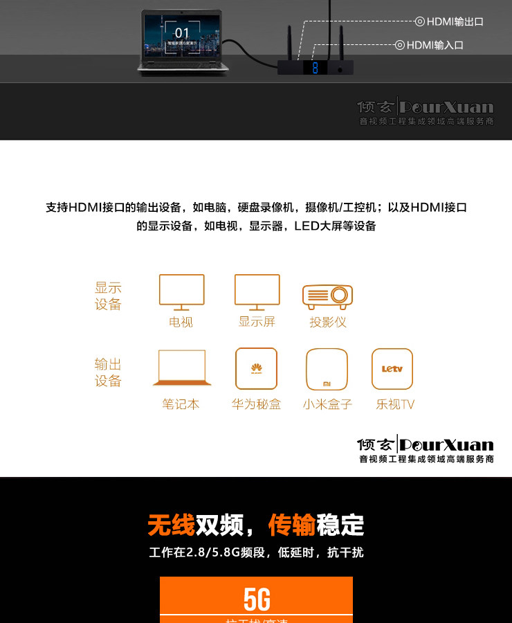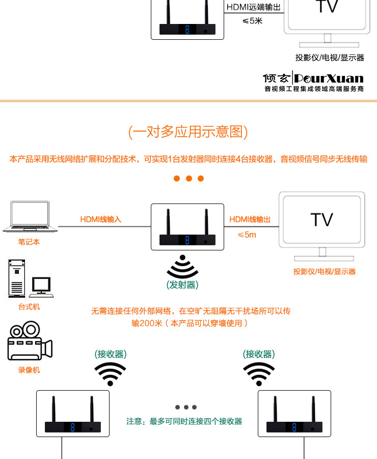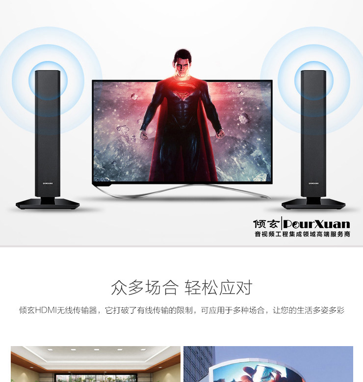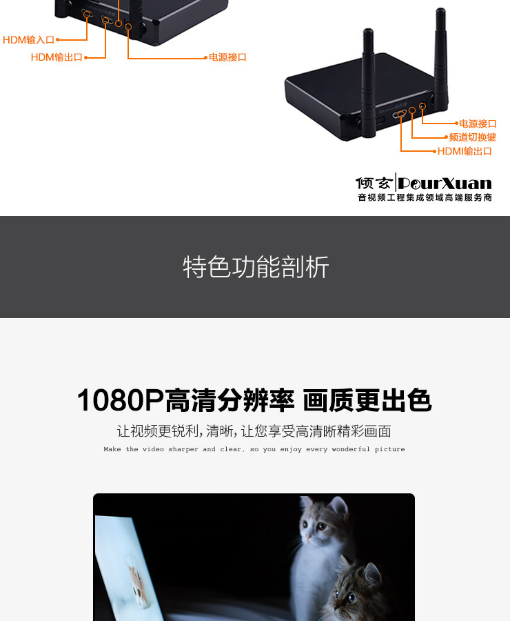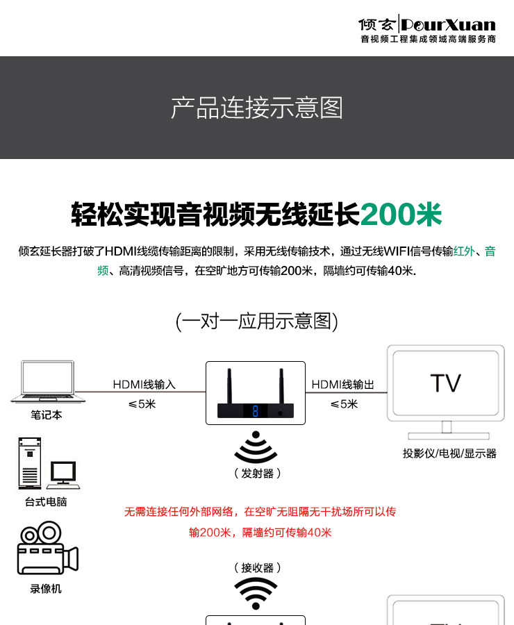 產品概述 | 此款無線HDMI傳輸器可以將設備源的全高清音頻和視頻無線傳輸到遠端電視,設備源和遠程電視之間不需要線纜連接,你可以在遠端自由地觀看全高清電視。安裝簡單,即插即用,不需要安裝軟件,不需要任何設置,2分鐘之內可以完成安裝!它采用分布式的無線技術,信號可以通過單一非高密度的墻壁或天花板,圖像和聲音零干擾,清晰流暢。無線HDMI傳輸器確保從具有HDMI輸出接口的AV設備到遠程電視的平穩信號流。由于穩定和未壓縮的全高清傳輸,它為您提供了身臨其境的媒體流體驗。 | |
