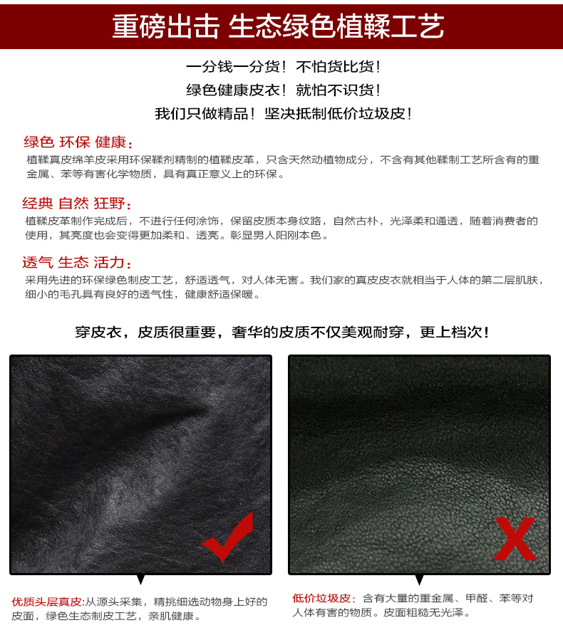 店長有話說親們!買一件真皮外套,真的不能只看價格,畢竟是陪伴您度過生活的每一天。一件低價皮衣,它的甲醛含量是超標的,天天穿身上您感覺不到,但是它散發的有害氣體事實在傷害您和您的家人。我們慕卡家選購都是價格偏昂貴的綠色生態皮料,無公害,只含天然動植物成分,不含有毒成分。