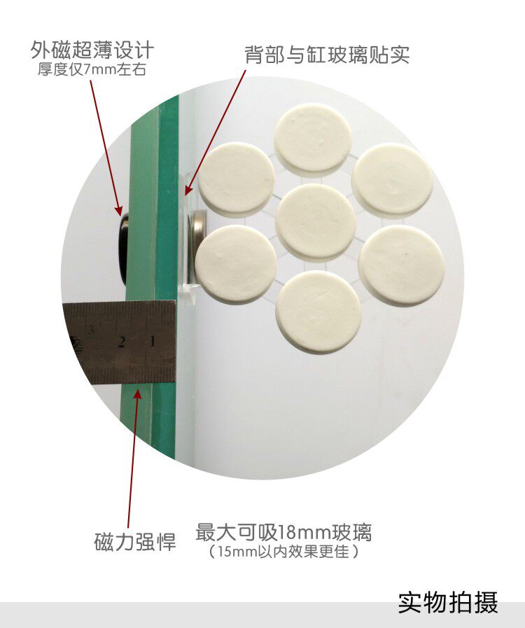 本品采用超強超薄磁鐵,缸外磁鐵厚度僅有7mm左右,而且磁力強勁,非市面普通強磁能比。外磁內磁均灌膠防水處理,玻璃厚度只要在18mm以內都好用。