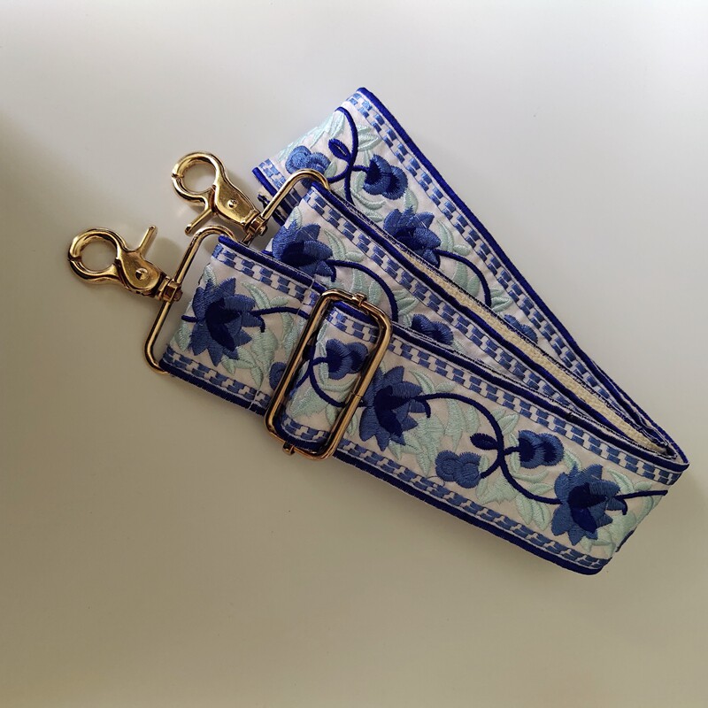 本白色純棉織帶青花系刺繡圖案 淺金色五金配件