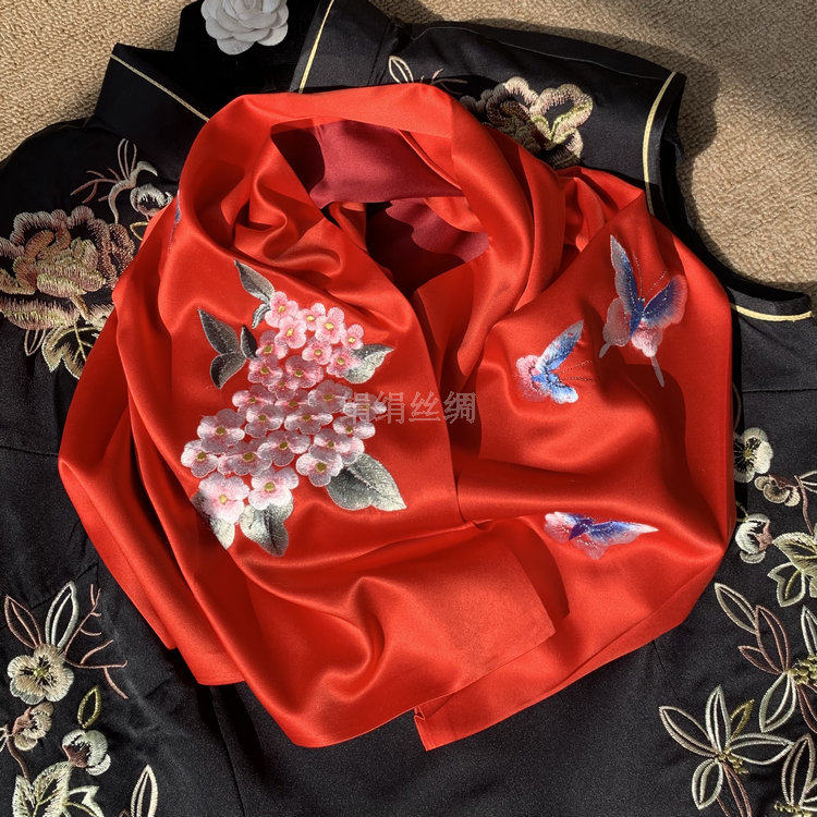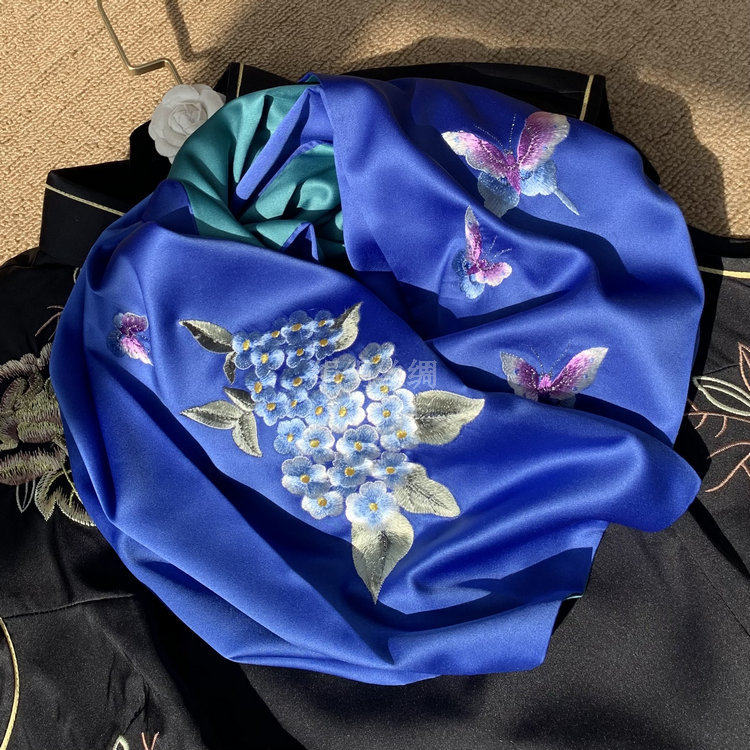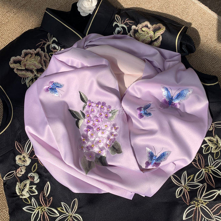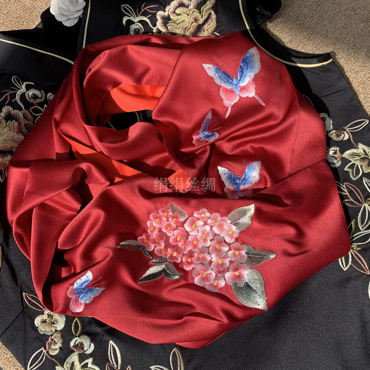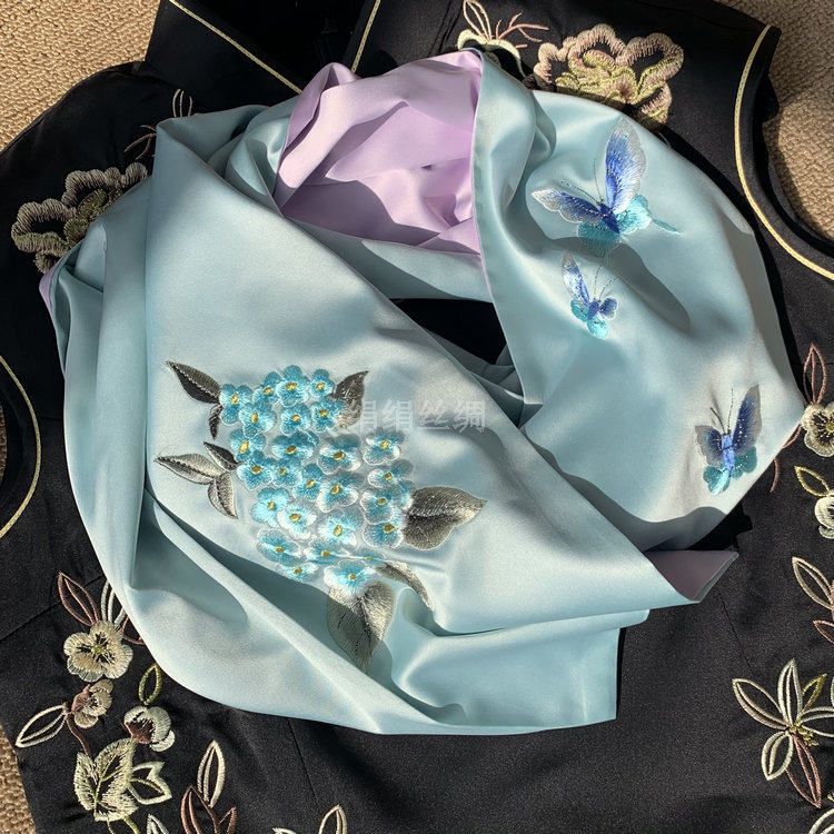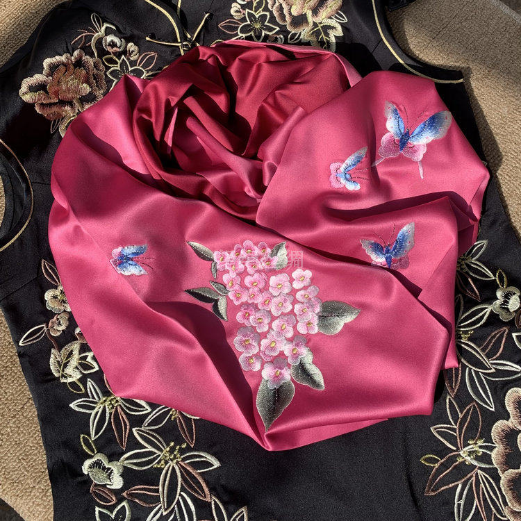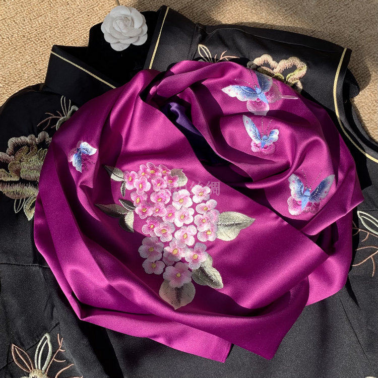 雙色雙層,正面層兩頭繡花(一頭繡球花,另一頭3個蝴蝶),