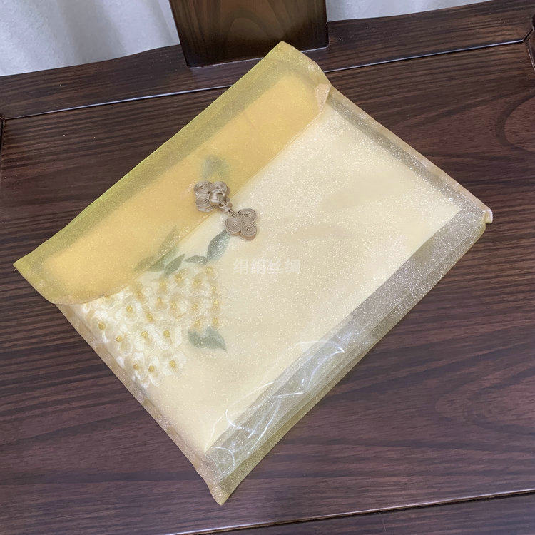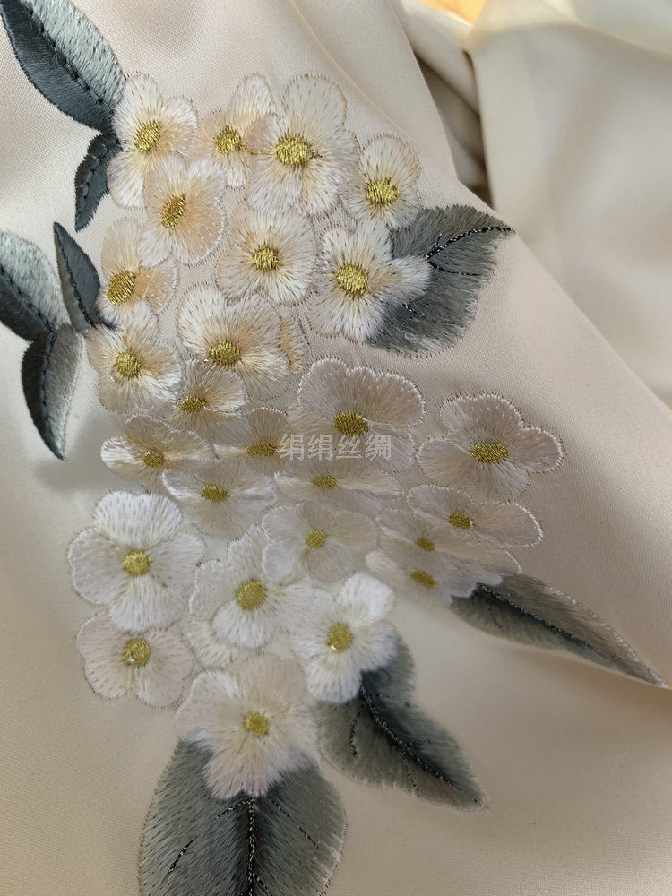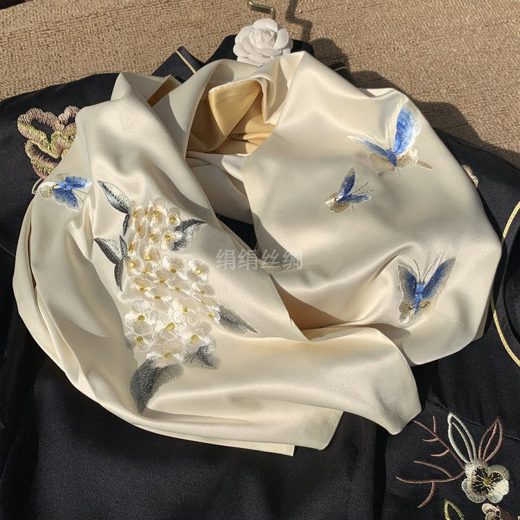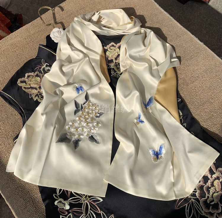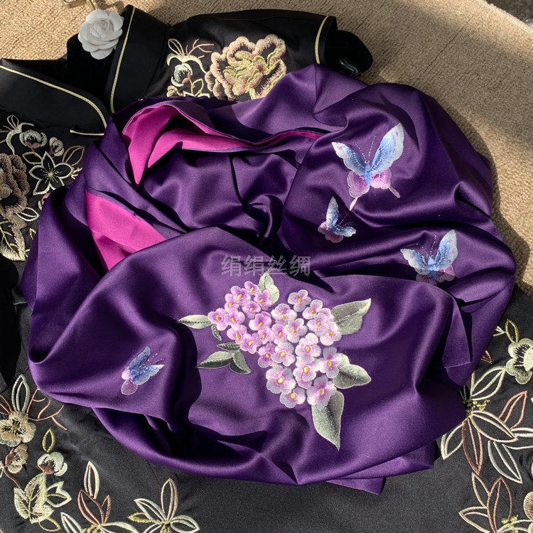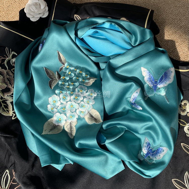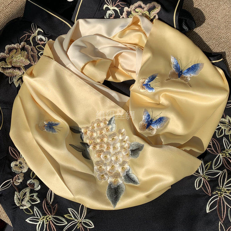 雙色雙層,正面層兩頭繡花(一頭繡球花,另一頭3個蝴蝶),