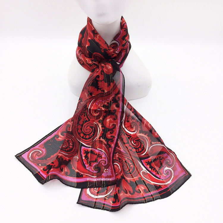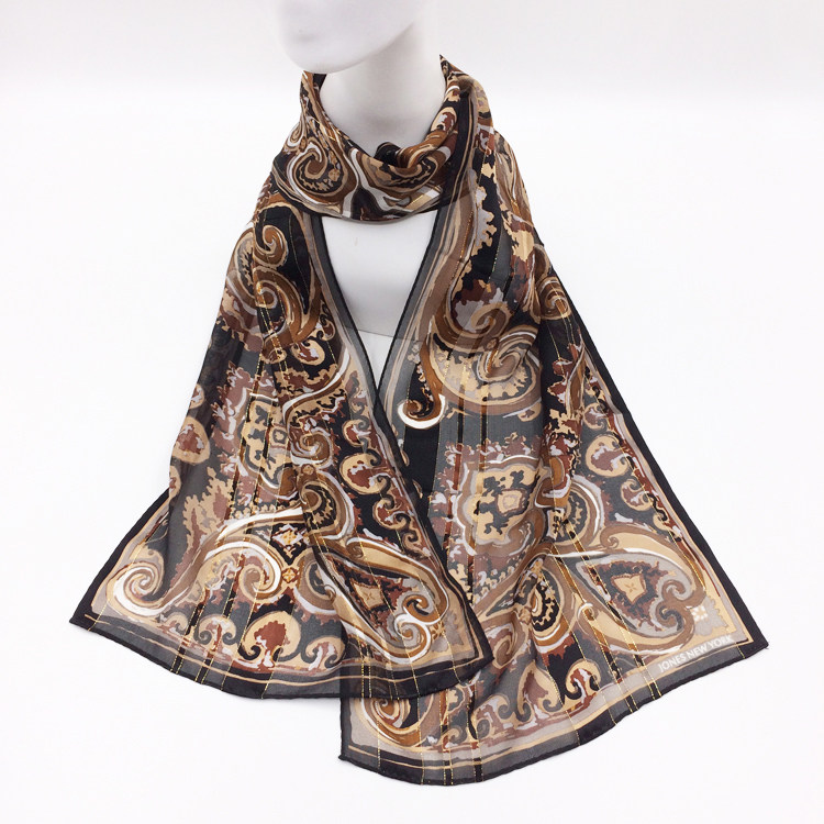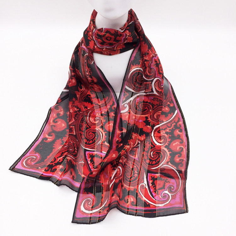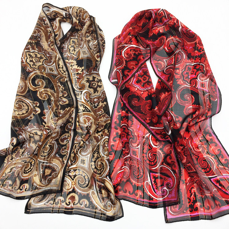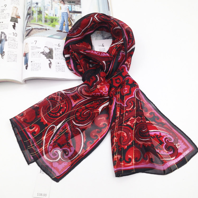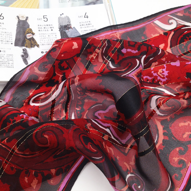真絲面料的一種工藝,一條緞面和一條綃面相隔,緞面平滑光澤,綃面輕薄透明,兩種面料不同的光感度,賦予了絲巾一種唯美變幻的效果。手感柔滑細膩,色澤純正,透氣性好,吸濕性佳,極具垂感。