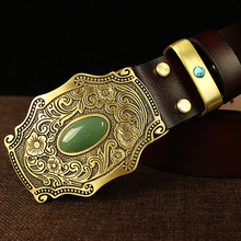 花開富貴唐草花銅扣鑲玉男士真皮皮帶牛皮 個性寶石潮流純銅腰帶