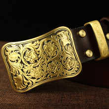 浮雕銅扣皮帶頭層牛皮男真皮復古皮帶純銅唐草花平滑扣青年腰帶